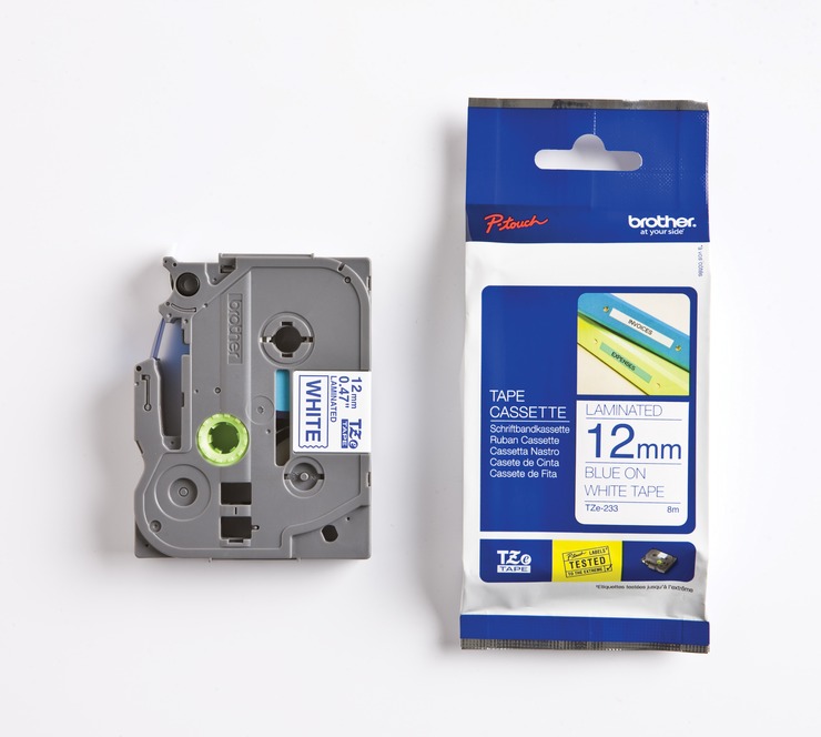 Schriftbandkassette TZE233. Material: laminiert ausgeführt. Größe (L x B)->unterschiedl. Einheiten: 8 m x 12 mm. Farbe Druck / Farbe Schriftband: blau / weiß.