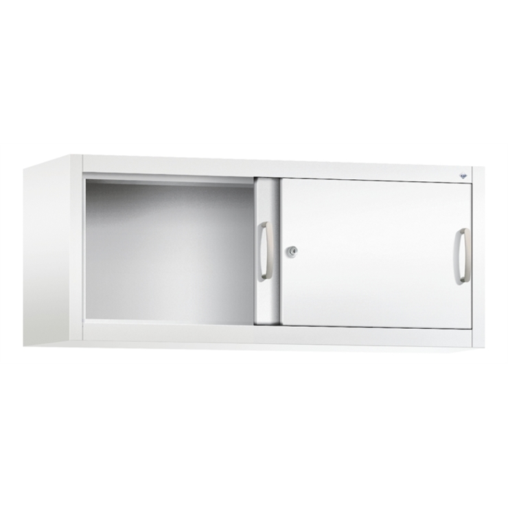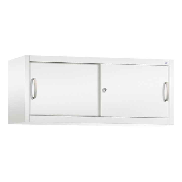 Stahl-Schiebetürenschrank Acurado-2000, als Aufsatzschrank, Korpus aus stabiler Stahlkonstruktion mit hochwertiger Einbrennbeschichtung für hohe UV-Beständigkeit, mit Kunststoffgleitern als praktischer Schrank- und Fußbodenschutz, hohe Flexibilität der Inneneinrichtung durch Höhenverstellbarkeit im 15 mm Raster, Türen verstärkt für hohe Stabilität, leichtgängige Bedienung durch Leichtlaufrollen in spezieller Schienenführung, 1 Wechselzylinder matt vernickelt mit 2 Schlüsseln, 2 Ergonomische Bügelgriffe Ergolock aus Metall für einfache Bedienung, matt vernickelt, Maße (H x B x T): 500 x 1200 x 400 mm, Korpus: RAL 9016 Verkehrsweiß, Türen: RAL 9016 Verkehrsweiß