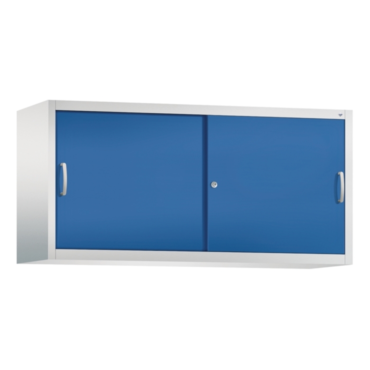 Stahl-Schiebetürenschrank Acurado-2000, als Aufsatzschrank, Korpus aus stabiler Stahlkonstruktion mit hochwertiger Einbrennbeschichtung für hohe UV-Beständigkeit, mit Kunststoffgleitern als praktischer Schrank- und Fußbodenschutz, hohe Flexibilität der Inneneinrichtung durch Höhenverstellbarkeit im 15 mm Raster, Türen verstärkt für hohe Stabilität, leichtgängige Bedienung durch Leichtlaufrollen in spezieller Schienenführung, mit Mitteltrennwand, 1 Wechselzylinder matt vernickelt mit 2 Schlüsseln, 2 Ergonomische Bügelgriffe Ergolock aus Metall für einfache Bedienung, matt vernickelt, 2 Einlegeböden aus Stahl, lackiert, mit hoher Traglast 70 kg, Maße (H x B x T): 790 x 1600 x 500 mm, Korpus: RAL 7035 Lichtgrau, Türen: RAL 5010 Enzianblau, Inneneinrichtung: RAL 7035 Lichtgrau