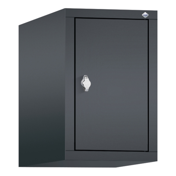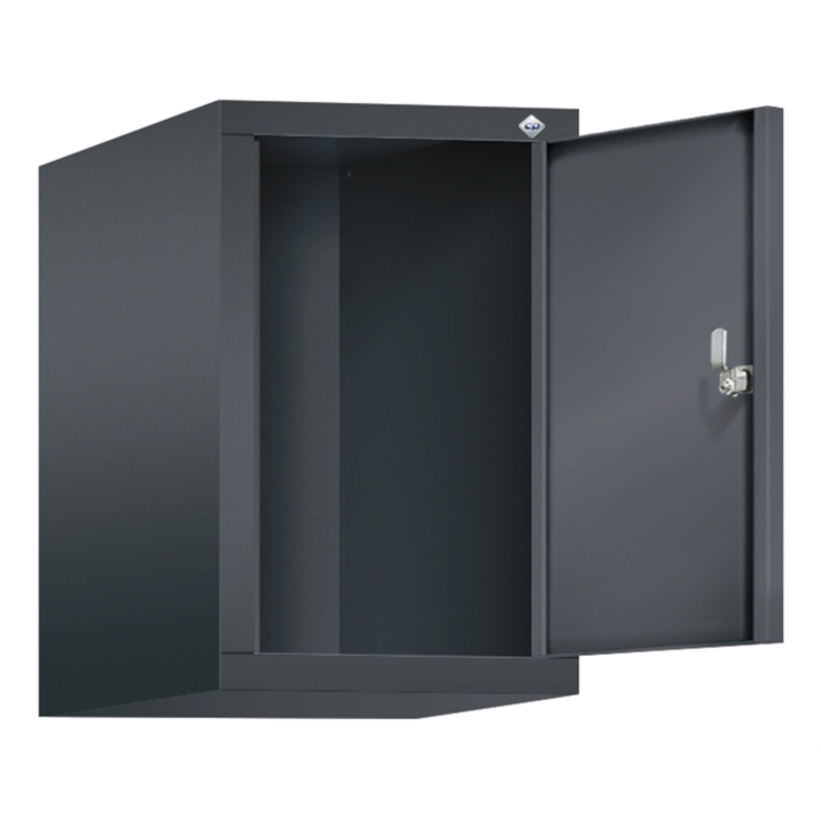 Stahl-Fächerschrank Classic, als Aufsatzschrank, 1 Abteil, Abteilbreite 300 mm, Türaufhängung oben und unten in Drehbolzen, rechts angeschlagen, 1 Drehriegel für Vorhangschloss, Maße (H x B x T): 500 x 320 x 500 mm, Korpus: RAL 7021 Schwarzgrau, Türen Stahl: RAL 7021 Schwarzgrau