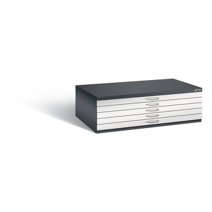 Stahl-Schubladenschrank Serie 7100_7200, als Flachablageschrank, Korpus aus stabiler Stahlkonstruktion mit hochwertiger Einbrennbeschichtung für hohe UV-Beständigkeit, mit Kunststoffgleitern als praktischer Schrank- und Fußbodenschutz, 1 Zentralverschluss mit Druckzylinderschloss und 2 Schlüsseln, 10 Ergonomische Bügelgriffe Ergolock aus Metall für einfache Bedienung, matt vernickelt, 10 voll ausziehbare Schubladen, 45 mm hoch, gerastert und unterteilbar für Formate bis DIN A1, hinten... (mehr)? Papersmart hilft Ihnen, den besten Anbieter für Ihren gesamten Warenkorb zu ermitteln.