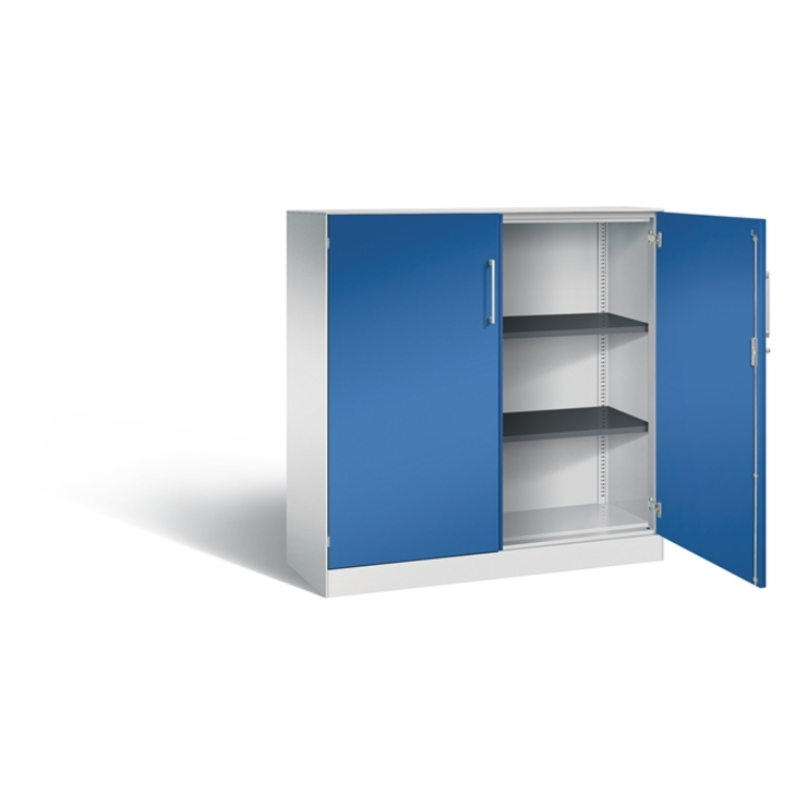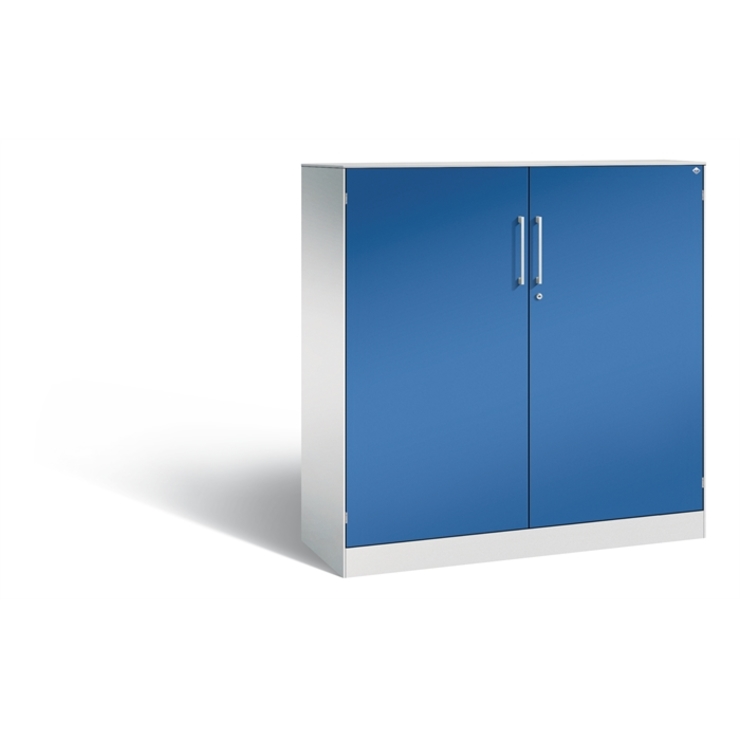 Stahl-Flügeltürenschrank Asisto, Korpus aus stabiler Stahlkonstruktion mit filigraner Kantenoptik und hochwertiger Einbrennbeschichtung für hohe UV-Beständigkeit, mit integrierter Niveauregulierung, bequem von innen bedienbar, hohe Flexibilität der Inneneinrichtung durch Höhenverstellbarkeit im 15 mm Raster, 1 Wechselzylinder matt vernickelt mit 2 Schlüsseln, 2 Ergonomische Design-Bügelgriffe für einfache Bedienung, aus Metall, matt vernickelt, 1 Abdeckplatte aus Stahl, 2 Stahltüren doppelwandig, gedämmt für angenehmes Geräuschverhalten, Türaufhängung in innen liegenden Scharnieren mit großzügigem Öffnungswinkel ca. 225 Grad, zueinanderschlagend für gemeinsamen Verschluss, 2 Einlegeböden aus Stahl lackiert, mit hoher Traglast von 70 kg, Maße (H x B x T): 1310 x 1200 x 435 mm, Korpus: RAL 7035 Lichtgrau, Türen: RAL 5010 Enzianblau, Inneneinrichtung: RAL 7021 Schwarzgrau