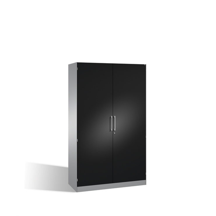 Stahl-Flügeltürenschrank Asisto, Korpus aus stabiler Stahlkonstruktion mit filigraner Kantenoptik und hochwertiger Einbrennbeschichtung für hohe UV-Beständigkeit, mit integrierter Niveauregulierung, bequem von innen bedienbar, hohe Flexibilität der Inneneinrichtung durch Höhenverstellbarkeit im 15 mm Raster, 1 Wechselzylinder matt vernickelt mit 2 Schlüsseln, 2 Ergonomische Design-Bügelgriffe für einfache Bedienung, aus Metall, matt vernickelt, 2 Stahltüren doppelwandig, gedämmt für angenehmes Geräuschverhalten, Türaufhängung in innen liegenden Scharnieren mit großzügigem Öffnungswinkel ca. 225 Grad, zueinanderschlagend für gemeinsamen Verschluss, 4 Einlegeböden aus Stahl lackiert, mit hoher Traglast von 70 kg, Maße (H x B x T): 1980 x 1200 x 435 mm, Korpus: RAL 9006 Weißaluminium, Türen: RAL 7021 Schwarzgrau, Inneneinrichtung: RAL 7021 Schwarzgrau