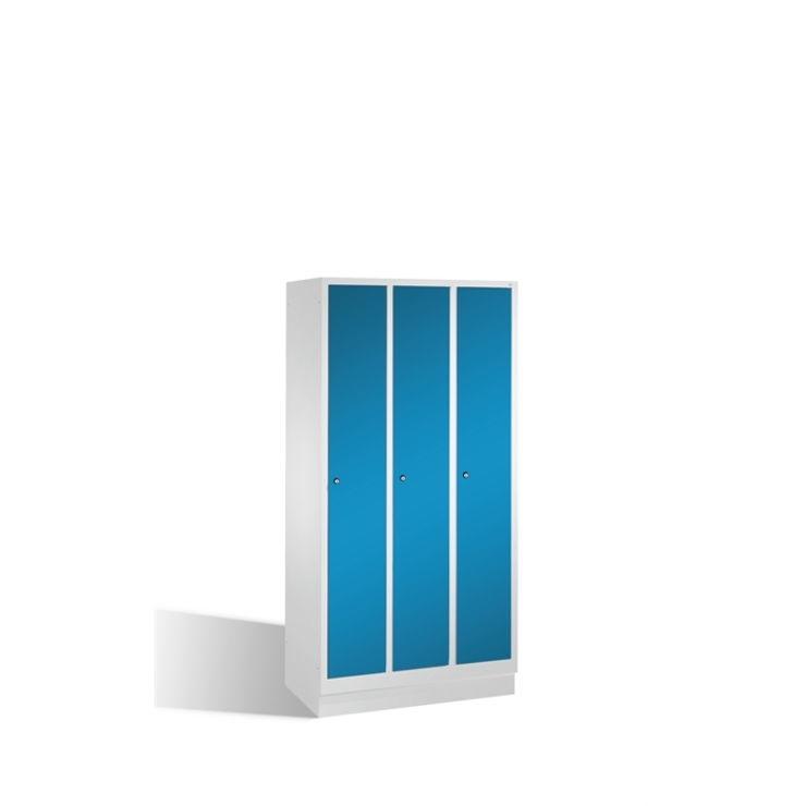 Stahl-Garderobenschrank Classic, 3 Abteile, Abteilbreite 300 mm, Korpus aus stabiler Stahlkonstruktion mit hochwertiger Einbrennbeschichtung für hohe UV- und Korrosionsbeständigkeit, innen je Abteil 1 Ablageboden, darunter 1 stabile Garderobenstange aus Ovalprofil mit 3 verdrehsicheren Schiebehaken, Schrankboden hinten mit Lüftungsöffnungen für optimale Luftzirkulation, auf 100 mm hohem Sockel, mit Kunststoffgleitern als praktischer Schrank- und Fußbodenschutz, vorne zurückgesetzt und oberhalb mit Luftdurchlass, 3 Zylinderschlösser mit je 2 Schlüsseln, Schließkreis bis 1000 verschiedene Schließungen, Türen mit Anschlagsdämpfer und mittiger Verstärkung für hohe Stabilität, mit eingeprägtem Etikettenrahmen, Türaufhängung in Drehbolzen, Maße (H x B x T): 1800 x 900 x 500 mm, Korpus: RAL 7035 Lichtgrau, Türen Stahl: RAL 5012 Lichtblau, Inneneinrichtung: RAL 7035 Lichtgrau