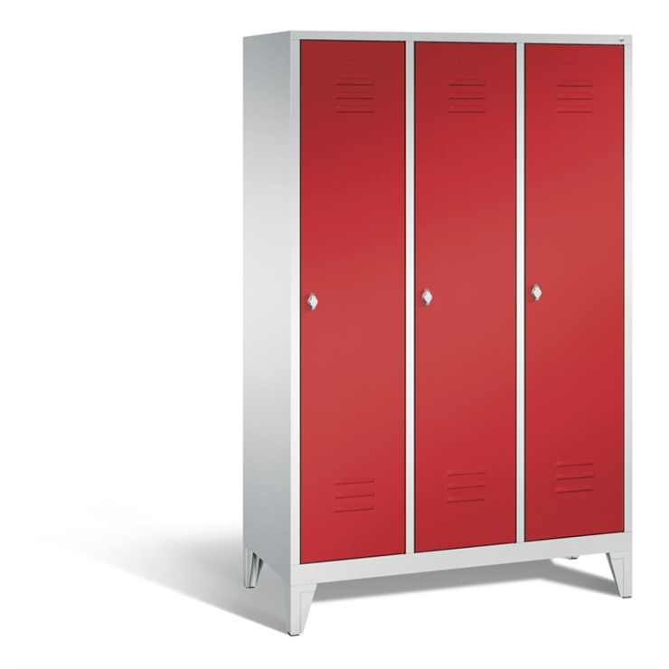 Stahl-Garderobenschrank Classic, 3 Abteile, Abteilbreite 400 mm, Korpus aus stabiler Stahlkonstruktion mit hochwertiger Einbrennbeschichtung für hohe UV- und Korrosionsbeständigkeit, innen je Abteil 1 Ablageboden, darunter 1 stabile Garderobenstange aus Ovalprofil mit 3 verdrehsicheren Schiebehaken, Schrankboden hinten mit Lüftungsöffnungen für optimale Luftzirkulation, auf 150 mm hohen Füßen aus Kunststoff für erweiterten Korrosionsschutz, 3 Drehriegel für Vorhängeschlösser, Türen mit Anschlagsdämpfer und mittiger Verstärkung für hohe Stabilität, mit Lüftungschlitzen oben und unten sowie eingestanztem Etikettenrahmen, Türaufhängung in Drehbolzen, Maße (H x B x T): 1850 x 1200 x 500 mm, Korpus: RAL 7035 Lichtgrau, Türen Stahl: RAL 3000 feuerrot, Inneneinrichtung: RAL 7035 Lichtgrau, Füße: RAL 7035 Lichtgrau