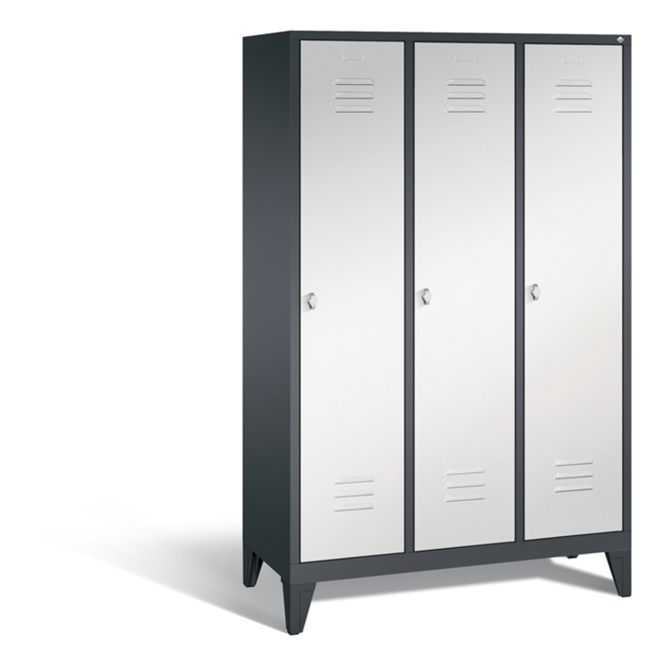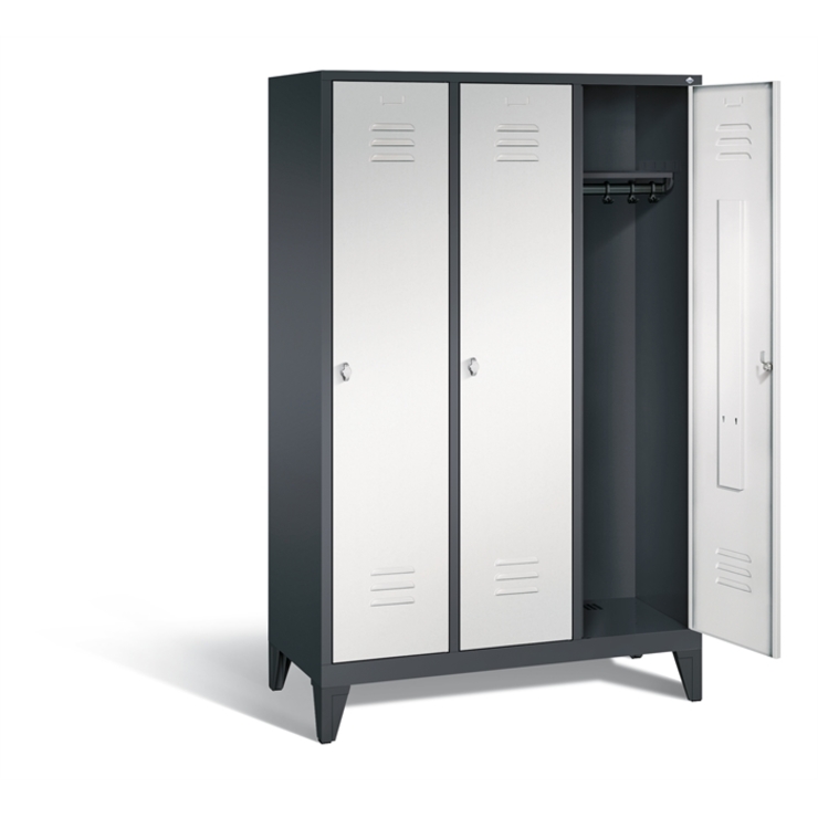 Stahl-Garderobenschrank Classic, 3 Abteile, Abteilbreite 400 mm, Korpus aus stabiler Stahlkonstruktion mit hochwertiger Einbrennbeschichtung für hohe UV- und Korrosionsbeständigkeit, innen je Abteil 1 Ablageboden, darunter 1 stabile Garderobenstange aus Ovalprofil mit 3 verdrehsicheren Schiebehaken, Schrankboden hinten mit Lüftungsöffnungen für optimale Luftzirkulation, auf 150 mm hohen Füßen aus Kunststoff für erweiterten Korrosionsschutz, 3 Drehriegel für Vorhängeschlösser, Türen mit Anschlagsdämpfer und mittiger Verstärkung für hohe Stabilität, mit Lüftungschlitzen oben und unten sowie eingestanztem Etikettenrahmen, Türaufhängung in Drehbolzen, Maße (H x B x T): 1850 x 1200 x 500 mm, Korpus: RAL 7021 Schwarzgrau, Türen Stahl: RAL 7035 Lichtgrau, Inneneinrichtung: RAL 7021 Schwarzgrau, Füße: RAL 9005 Tiefschwarz