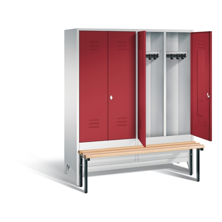 Stahl-Garderobenschrank Classic, 4 Abteile für 2 Personen, Abteilbreite 400 mm,Türen paarweise zueinanderschlagend für gemeinsamen Verschluss, Korpus aus stabiler Stahlkonstruktion mit hochwertiger Einbrennbeschichtung für hohe UV- und Korrosionsbeständigkeit, innen je Abteil 1 Ablageboden, darunter 1 stabile Garderobenstange aus Ovalprofil mit 3 verdrehsicheren Schiebehaken, Schrankboden hinten mit Lüftungsöffnungen für optimale Luftzirkulation, auf 150 mm hohen Füßen aus Kunststoff für optimalen Korrosionsschutz, mit vorgebauter Sitzbank (dadurch Türen verkürzt), Gestell aus stabilem Vierkant-Stahlrohr 30 x 30 mm, mit verstellbaren Bodengleitern für einfachen Niveauausgleich, 2 Drehriegel für Vorhängeschlösser, Türen mit Anschlagsdämpfer und mittiger Verstärkung für hohe Stabilität, mit Lüftungschlitzen oben und unten sowie eingestanztem Etikettenrahmen, Türaufhängung in Drehbolzen, 1 Sitzleisten aus Buche-Hartholz, im Profil ca. 60 x 30 mm, allseitig gehobelt, oben abgerundet für guten Sitzkomfort, klarlackiert mit naturgegebenen Farbunterschieden, Maße (H x B x T): 1850 x 1590 x 500 mm, Korpus: RAL 7035 Lichtgrau, Türen Stahl: RAL 3003 Rubinrot, Inneneinrichtung: RAL 7035 Lichtgrau, Füße: RAL 7035 Lichtgrau, Gestell: RAL 7021 Schwarzgrau