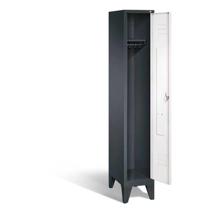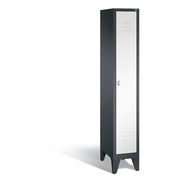 Stahl-Garderobenschrank Classic, 1 Abteil, Abteilbreite 300 mm, Korpus aus stabiler Stahlkonstruktion mit hochwertiger Einbrennbeschichtung für hohe UV- und Korrosionsbeständigkeit, innen je Abteil 1 Ablageboden, darunter 1 stabile Garderobenstange aus Ovalprofil mit 3 verdrehsicheren Schiebehaken, Schrankboden hinten mit Lüftungsöffnungen für optimale Luftzirkulation, auf 150 mm hohen Füßen aus Kunststoff für erweiterten Korrosionsschutz, 1 Drehriegel für Vorhangschloss, Tür mit Anschlagsdämpfer und mittiger Verstärkung für hohe Stabilität, mit Lüftungschlitzen oben und unten sowie eingestanztem Etikettenrahmen, Türaufhängung in Drehbolzen, Maße (H x B x T): 1850 x 320 x 500 mm, Korpus: RAL 7021 Schwarzgrau, Türen Stahl: RAL 9016 Verkehrsweiß, Inneneinrichtung: RAL 7021 Schwarzgrau, Füße: RAL 9005 Tiefschwarz