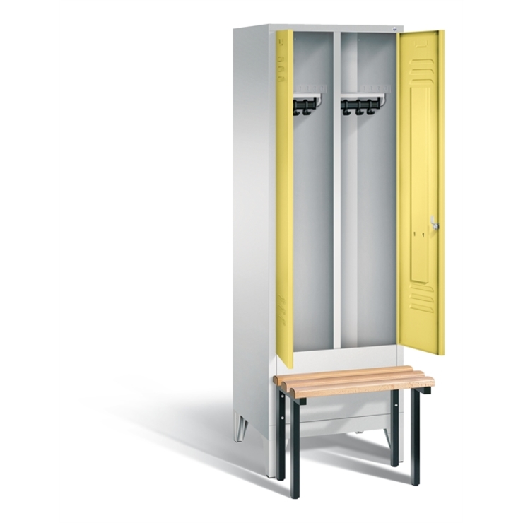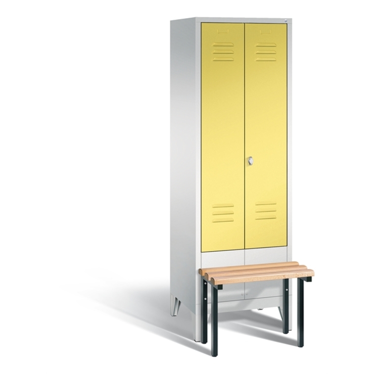 Stahl-Garderobenschrank Classic, 2 Abteile für 1 Person, Abteilbreite 300 mm, Türen zueinanderschlagend für gemeinsamen Verschluss, Korpus aus stabiler Stahlkonstruktion mit hochwertiger Einbrennbeschichtung für hohe UV- und Korrosionsbeständigkeit, innen je Abteil 1 Ablageboden, darunter 1 stabile Garderobenstange aus Ovalprofil mit 3 verdrehsicheren Schiebehaken, Schrankboden hinten mit Lüftungsöffnungen für optimale Luftzirkulation, auf 100 mm hohem Sockel, mit Kunststoffgleitern als praktischer Schrank- und Fußbodenschutz, vorne zurückgesetzt und oberhalb mit Luftdurchlass, 1 Drehriegel für Vorhangschloss, Türen mit Anschlagsdämpfer und mittiger Verstärkung für hohe Stabilität, mit Lüftungschlitzen oben und unten sowie eingestanztem Etikettenrahmen, Türaufhängung in Drehbolzen, 1 Sitzleisten aus Buche-Hartholz, im Profil ca. 60 x 30 mm, allseitig gehobelt, oben abgerundet für guten Sitzkomfort, klarlackiert mit naturgegebenen Farbunterschieden, Maße (H x B x T): 1850 x 610 x 500 mm, Korpus: RAL 7035 Lichtgrau, Türen Stahl: 0959059 RDS Schwefelgelb, Inneneinrichtung: RAL 7035 Lichtgrau, Füße: RAL 7035 Lichtgrau, Gestell: RAL 7021 Schwarzgrau