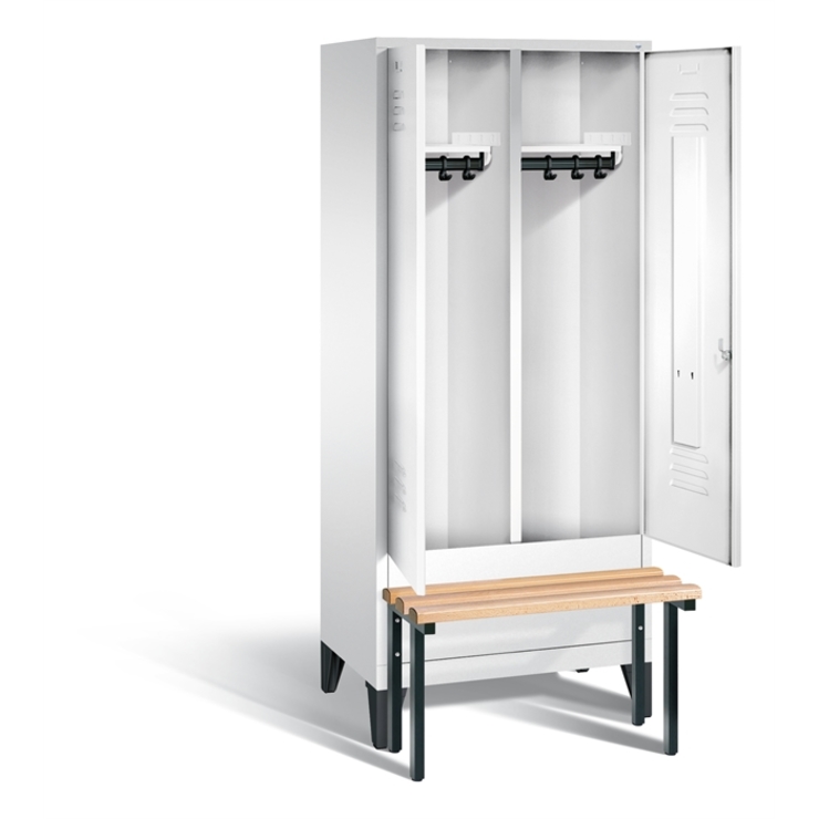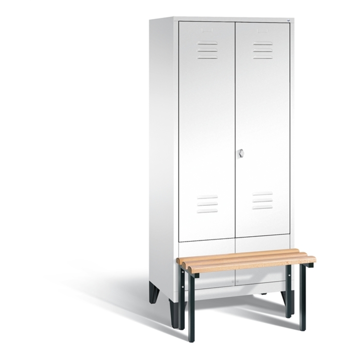 Stahl-Garderobenschrank Classic, 2 Abteile für 1 Person, Abteilbreite 400 mm, Türen zueinanderschlagend für gemeinsamen Verschluss, Korpus aus stabiler Stahlkonstruktion mit hochwertiger Einbrennbeschichtung für hohe UV- und Korrosionsbeständigkeit, innen je Abteil 1 Ablageboden, darunter 1 stabile Garderobenstange aus Ovalprofil mit 3 verdrehsicheren Schiebehaken, Schrankboden hinten mit Lüftungsöffnungen für optimale Luftzirkulation, auf 100 mm hohem Sockel, mit Kunststoffgleitern als praktischer Schrank- und Fußbodenschutz, vorne zurückgesetzt und oberhalb mit Luftdurchlass, 1 Drehriegel für Vorhangschloss, Türen mit Anschlagsdämpfer und mittiger Verstärkung für hohe Stabilität, mit Lüftungschlitzen oben und unten sowie eingestanztem Etikettenrahmen, Türaufhängung in Drehbolzen, 1 Sitzleisten aus Buche-Hartholz, im Profil ca. 60 x 30 mm, allseitig gehobelt, oben abgerundet für guten Sitzkomfort, klarlackiert mit naturgegebenen Farbunterschieden, Maße (H x B x T): 1850 x 810 x 500 mm, Korpus: RAL 9016 Verkehrsweiß, Türen Stahl: RAL 9016 Verkehrsweiß, Inneneinrichtung: RAL 9016 Verkehrsweiß, Füße: RAL 9005 Tiefschwarz, Gestell: RAL 7021 Schwarzgrau