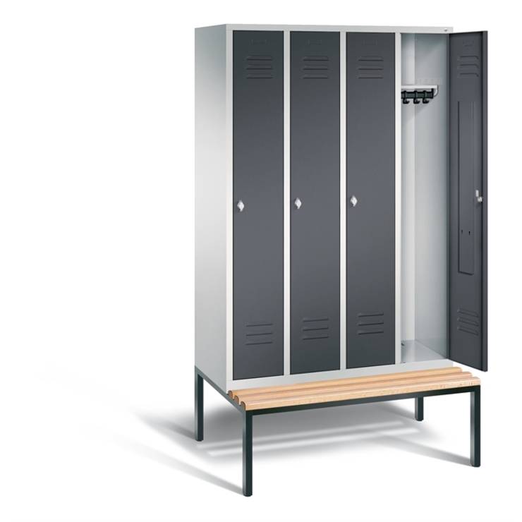 Stahl-Garderobenschrank Classic, 4 Abteile, Abteilbreite 300 mm, Korpus aus stabiler Stahlkonstruktion mit hochwertiger Einbrennbeschichtung für hohe UV- und Korrosionsbeständigkeit, innen je Abteil 1 Ablageboden, darunter 1 stabile Garderobenstange aus Ovalprofil mit 3 verdrehsicheren Schiebehaken, Schrankboden hinten mit Lüftungsöffnungen für optimale Luftzirkulation, auf untergebauter Sitzbank, Gestell aus stabilem Vierkant-Stahlrohr 30 x 30 mm, mit verstellbaren Bodengleitern für einfachen Niveauausgleich, 4 Drehriegel für Vorhängeschlösser, Türen mit Anschlagsdämpfer und mittiger Verstärkung für hohe Stabilität, mit Lüftungschlitzen oben und unten sowie eingestanztem Etikettenrahmen, Türaufhängung in Drehbolzen, 1 Sitzleisten aus Buche-Hartholz, im Profil ca. 60 x 30 mm, allseitig gehobelt, oben abgerundet für guten Sitzkomfort, klarlackiert mit naturgegebenen Farbunterschieden, 1 Maße (H x B x T): 2090 x 1190 x 815 mm, Korpus: RAL 7035 Lichtgrau, Türen Stahl: RAL 7021 Schwarzgrau, Inneneinrichtung: RAL 7035 Lichtgrau, Gestell: RAL 7021 Schwarzgrau