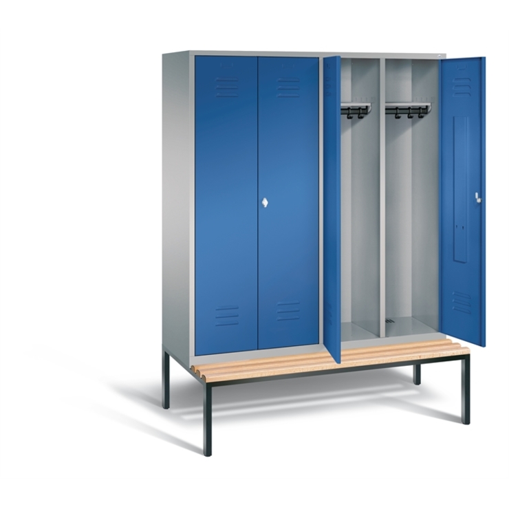 Stahl-Garderobenschrank Classic, 4 Abteile für 2 Personen, Abteilbreite 400 mm,Türen paarweise zueinanderschlagend für gemeinsamen Verschluss, Korpus aus stabiler Stahlkonstruktion mit hochwertiger Einbrennbeschichtung für hohe UV- und Korrosionsbeständigkeit, innen je Abteil 1 Ablageboden, darunter 1 stabile Garderobenstange aus Ovalprofil mit 3 verdrehsicheren Schiebehaken, Schrankboden hinten mit Lüftungsöffnungen für optimale Luftzirkulation, auf untergebauter Sitzbank, Gestell aus stabilem Vierkant-Stahlrohr 30 x 30 mm, mit verstellbaren Bodengleitern für einfachen Niveauausgleich, 2 Drehriegel für Vorhängeschlösser, Türen mit Anschlagsdämpfer und mittiger Verstärkung für hohe Stabilität, mit Lüftungschlitzen oben und unten sowie eingestanztem Etikettenrahmen, Türaufhängung in Drehbolzen, 1 Sitzleisten aus Buche-Hartholz, im Profil ca. 60 x 30 mm, allseitig gehobelt, oben abgerundet für guten Sitzkomfort, klarlackiert mit naturgegebenen Farbunterschieden, 1 Maße (H x B x T): 2090 x 1590 x 815 mm, Korpus: RAL 9006 Weißaluminium, Türen Stahl: RAL 5010 Enzianblau, Inneneinrichtung: RAL 9006 Weißaluminium, Gestell: RAL 7021 Schwarzgrau