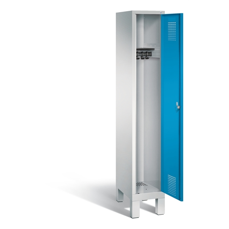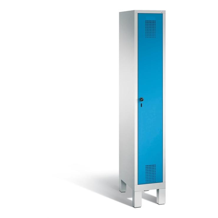 Stahl-Garderobenschrank Evolo, 1 Abteil, Abteilbreite 300 mm, Korpus aus stabiler Stahlkonstruktion mit hochwertiger Einbrennbeschichtung für hohe UV- und Korrosionsbeständigkeit, innen je Abteil 1 Ablageboden, darunter 1 stabile Garderobenstange aus Ovalprofil mit 3 verdrehsicheren Schiebehaken, Schrankboden hinten mit großflächigem Luftdurchlass für optimale Luftzirkulation, auf 150 mm hohen Füßen aus Kunststoff für erweiterten Korrosionsschutz, mit integrierter Niveauregulierung und Schutzhülsen zur stilvollen Abdeckung der Verstellschrauben, bequem von innen und außen verstellbar, 1 Ergonomischer Sicherheits-Drehriegel für Vorhangschloss inkl. Tür-Schutz, Tür mit Anschlagsdämpfer und geschlossenen Seitenprofilen für höchste Stabilität und Einbruchsicherheit, mit reinigungsfreundlichem Belüftungslochbild oben und unten sowie eingeprägtem Etikettenrahmen, Türaufhängung in Drehbolzen, Maße (H x B x T): 1850 x 320 x 500 mm, Korpus: RAL 7035 Lichtgrau, Türen Stahl: RAL 5012 Lichtblau, Füße: RAL 7035 Lichtgrau, Inneneinrichtung: RAL 7021 Schwarzgrau