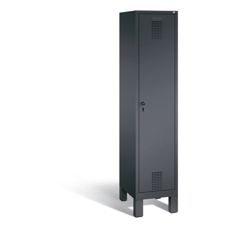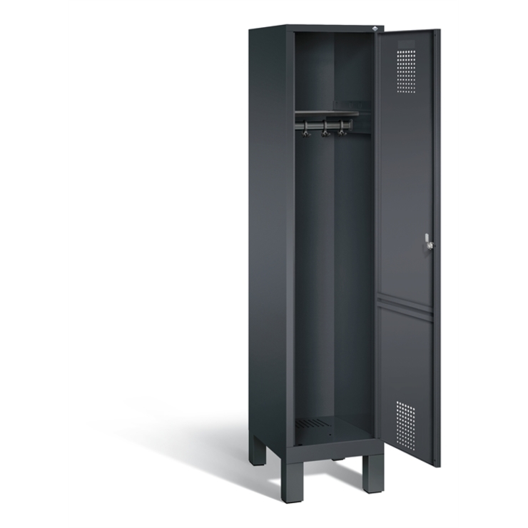 Stahl-Garderobenschrank Evolo, 1 Abteil, Abteilbreite 400 mm, Korpus aus stabiler Stahlkonstruktion mit hochwertiger Einbrennbeschichtung für hohe UV- und Korrosionsbeständigkeit, innen je Abteil 1 Ablageboden, darunter 1 stabile Garderobenstange aus Ovalprofil mit 3 verdrehsicheren Schiebehaken, Schrankboden hinten mit großflächigem Luftdurchlass für optimale Luftzirkulation, auf 150 mm hohen Füßen aus Kunststoff für erweiterten Korrosionsschutz, mit integrierter Niveauregulierung und Schutzhülsen zur stilvollen Abdeckung der Verstellschrauben, bequem von innen und außen verstellbar, 1 Ergonomischer Sicherheits-Drehriegel für Vorhangschloss inkl. Tür-Schutz, Tür mit Anschlagsdämpfer und geschlossenen Seitenprofilen für höchste Stabilität und Einbruchsicherheit, mit reinigungsfreundlichem Belüftungslochbild oben und unten sowie eingeprägtem Etikettenrahmen, Türaufhängung in Drehbolzen, Maße (H x B x T): 1850 x 420 x 500 mm, Korpus: RAL 7021 Schwarzgrau, Türen Stahl: RAL 7021 Schwarzgrau, Füße: RAL 9005 Tiefschwarz, Inneneinrichtung: RAL 7021 Schwarzgrau