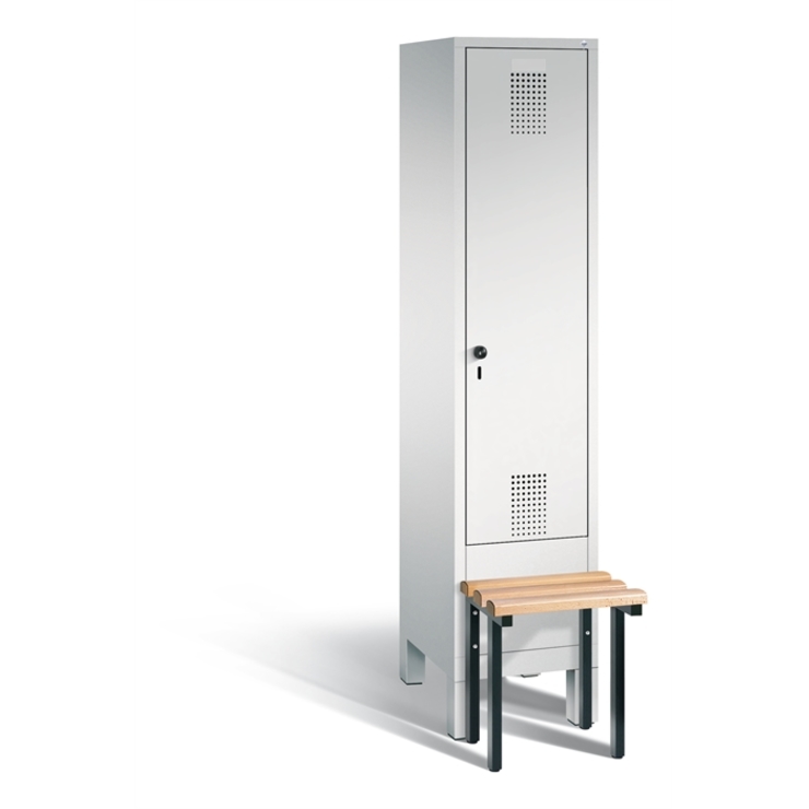 Stahl-Garderobenschrank Evolo, 1 Abteil, Abteilbreite 400 mm, Korpus aus stabiler Stahlkonstruktion mit hochwertiger Einbrennbeschichtung für hohe UV- und Korrosionsbeständigkeit, innen je Abteil 1 Ablageboden, darunter 1 stabile Garderobenstange aus Ovalprofil mit 3 verdrehsicheren Schiebehaken, Schrankboden hinten mit großflächigem Luftdurchlass für optimale Luftzirkulation, auf 150 mm hohen Füßen aus Kunststoff für optimalen Korrosionsschutz, mit integrierter Niveauregulierung und Schutzhülsen zur stilvollen Abdeckung der Verstellschrauben, bequem von innen und außen verstellbar, mit vorgebauter Sitzbank (dadurch Türen verkürzt), Gestell aus stabilem Vierkant-Stahlrohr 30 x 30 mm, mit verstellbaren Bodengleitern für einfachen Niveauausgleich, 1 Ergonomischer Sicherheits-Drehriegel für Vorhangschloss inkl. Tür-Schutz, Tür mit Anschlagsdämpfer und geschlossenen Seitenprofilen für höchste Stabilität und Einbruchsicherheit, mit reinigungsfreundlichem Belüftungslochbild oben und unten sowie eingeprägtem Etikettenrahmen, Türaufhängung in Drehbolzen, 1 Sitzleisten aus Buche-Hartholz, im Profil ca. 60 x 30 mm, allseitig gehobelt, oben abgerundet für guten Sitzkomfort, klarlackiert mit naturgegebenen Farbunterschieden, Maße (H x B x T): 1850 x 420 x 815 mm, Korpus: RAL 7035 Lichtgrau, Türen Stahl: RAL 7035 Lichtgrau, Füße: RAL 7035 Lichtgrau, Inneneinrichtung: RAL 7021 Schwarzgrau, Gestell: RAL 7021 Schwarzgrau