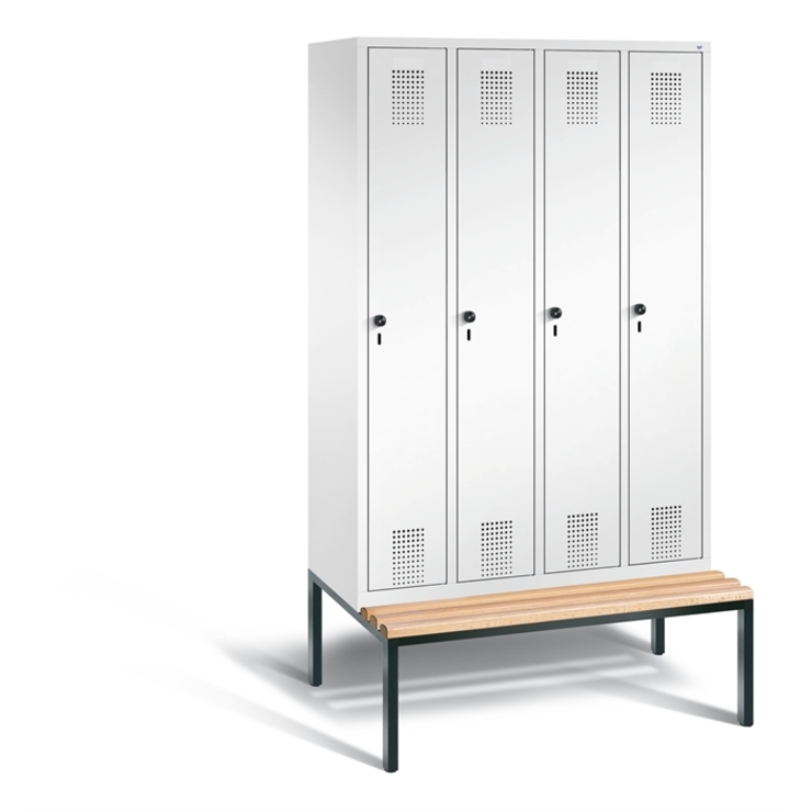 Stahl-Garderobenschrank Classic, auf untergebauter Sitzbank, Gestell aus stabilem Vierkant-Stahlrohr 30 x 30 mm, mit verstellbaren Bodengleitern für einfachen Niveauausgleich, 2 Abteile, Abteilbreite 400 mm, z-förmig unterteilt für 4 Personen, Korpus aus stabiler Stahlkonstruktion mit hochwertiger Einbrennbeschichtung für hohe UV- und Korrosionsbeständigkeit, innen komfortable Hängemöglichkeit langer Kleidungsstücke trotz geringem Platzangebot, je Fach 1 stabile Garderobenstange aus... (mehr)? Papersmart hilft Ihnen, den besten Anbieter für Ihren gesamten Warenkorb zu ermitteln.