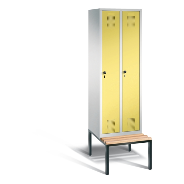 Stahl-Garderobenschrank Evolo, 2 Abteile, Abteilbreite 300 mm, Korpus aus stabiler Stahlkonstruktion mit hochwertiger Einbrennbeschichtung für hohe UV- und Korrosionsbeständigkeit, innen je Abteil 1 Ablageboden, darunter 1 stabile Garderobenstange aus Ovalprofil mit 3 verdrehsicheren Schiebehaken, Schrankboden hinten mit großflächigem Luftdurchlass für optimale Luftzirkulation, auf untergebauter Sitzbank, Gestell aus stabilem Vierkant-Stahlrohr 30 x 30 mm, mit verstellbaren Bodengleitern für einfachen Niveauausgleich, 2 Ergonomische Sicherheits-Drehriegel für Vorhängeschlösser inkl. Tür-Schutz, Türen mit Anschlagsdämpfer und geschlossenen Seitenprofilen für höchste Stabilität und Einbruchsicherheit, mit reinigungsfreundlichem Belüftungslochbild oben und unten sowie eingeprägtem Etikettenrahmen, Türaufhängung in Drehbolzen, 1 Entfall der Füße 1 Sitzleisten aus Buche-Hartholz, im Profil ca. 60 x 30 mm, allseitig gehobelt, oben abgerundet für guten Sitzkomfort, klarlackiert mit naturgegebenen Farbunterschieden, 1 Maße (H x B x T): 2090 x 610 x 815 mm, Korpus: RAL 7035 Lichtgrau, Türen Stahl: 0959059 RDS Schwefelgelb, Inneneinrichtung: RAL 7021 Schwarzgrau, Gestell: RAL 7021 Schwarzgrau