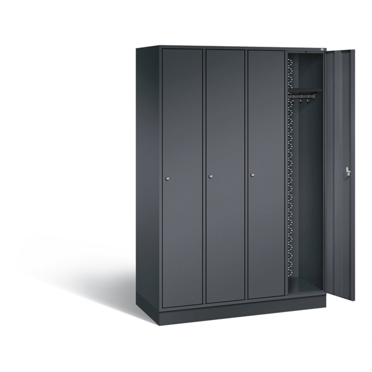 Stahl-Garderobenschrank Intro, 4 Abteile, Abteilbreite 300 mm, Korpus aus stabiler Stahlkonstruktion mit hochwertiger Einbrennbeschichtung für hohe UV- und Korrosionsbeständigkeit, Türen verstärkt für hohe Stabilität mit Anschlagsdämpfer, Türaufhängung durchgängig mit robustem Scharnierband, rechts angeschlagen, innen je Abteil 1 Ablageboden und 1 stabile Garderobenstange aus Ovalprofil mit 3 verdrehsicheren Schiebehaken, mit Belüftungslochbild in der Rückwand und 18 mm Wandabstandshaltern, auf 100 mm hohem Sockel, 4 Zylinderschlösser mit je 2 Schlüsseln, Schließkreis bis 1000 verschiedene Schließungen, Maße (H x B x T): 1950 x 1220 x 490 mm, Korpus: RAL 7021 Schwarzgrau, Türen: RAL 7021 Schwarzgrau, Sockel: RAL 7021 Schwarzgrau