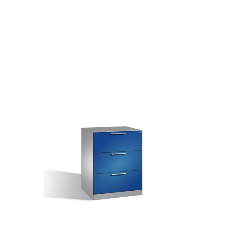 Stahl-Schubladenschrank Asisto, als Hängeregistraturschrank, Korpus aus stabiler Stahlkonstruktion, körperschallgedämpft für angenehmes Geräuschverhalten, mit filigraner Kantenoptik und hochwertiger Einbrennbeschichtung für hohe UV- Beständigkeit, mit integrierter Niveauregulierung von innen bedienbar, 3 voll ausziehbare Schubladen, 2-bahnig, für Hängehefter DIN A4 quer, 1 Wechselzylinder matt vernickelt mit 2 Schlüsseln, 3 Ergonomische Design-Bügelgriffe für einfache Bedienung, aus Metall, matt vernickelt, 1 selbstklebender Kunststoff-Etikettenrahmen, zur Ergänzung der beiliegenden Beschriftungsschilder, inkl. Etikett und Klarsicht-Abdeckung, Set bestehend aus 3 Stück, 1 Schubladenblenden aus Stahl, 2 Schubladenblenden aus Stahl, 1 filigrane Stahl-Abdeckplatte, schallgedämmt Maße (H x B x T): 1010 x 800 x 600 mm, Korpus: RAL 9006 Weißaluminium, Blenden: RAL 5010 Enzianblau, Inneneinrichtung: RAL 7021 Schwarzgrau