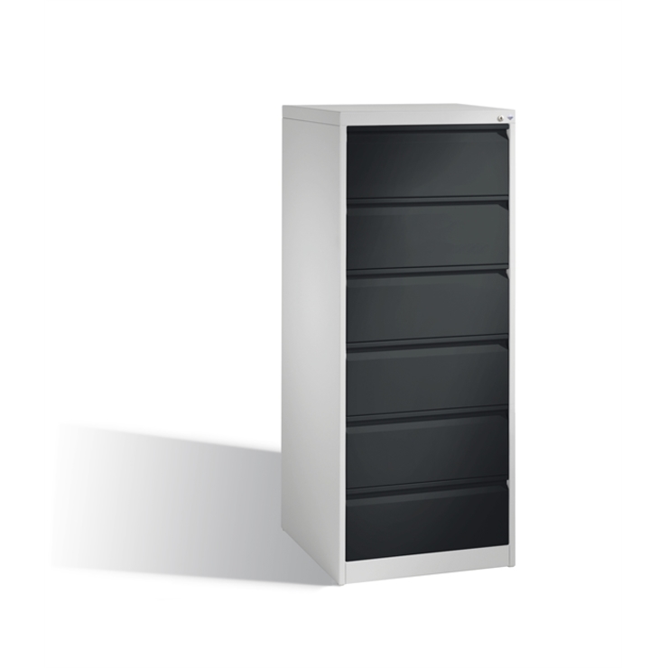 Stahl-Schubladenschrank Acurado, als Karteischrank, Korpus aus stabiler Stahlkonstruktion mit hochwertiger Einbrennbeschichtung für hohe UV-Beständigkeit, 6 voll ausziehbare Schubladen mit integrierter durchgehender Griffleiste, 2- bahnig, für Karteikarten DIN A5 quer mit 2 verstellbaren Pendelblechen je Bahn, Schubladenwannen lackiert, auf langlebigen 2-fach Teleskopschienen mit hoher Traglast von 50 Kg je Schub, inkl. Auszugsperre, Zentralverschluss, 1 Wechselzylinder matt vernickelt mit 2 Schlüsseln, 6 hochwertige Etikettenrahmen aus Kunststoff, selbstklebend, inkl. weißem Beschriftungsschild, Maße (H x B x T): 1357 x 553 x 590 mm, Korpus: RAL 7035 Lichtgrau, Blenden: RAL 7021 Schwarzgrau, Inneneinrichtung: RAL 7035 Lichtgrau