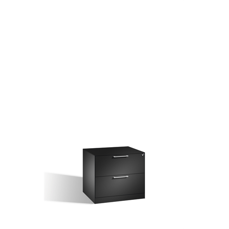 Stahl-Schubladenschrank Asisto, als Karteischrank, Korpus aus stabiler Stahlkonstruktion, körperschallgedämpft für angenehmes Geräuschverhalten, mit filigraner Kantenoptik und hochwertiger Einbrennbeschichtung für hohe UV- Beständigkeit, mit integrierter Niveauregulierung von innen bedienbar, 2 voll ausziehbare Schubladen, 2-bahnig, für Karteikarten DIN A4 quer, mit 3 verstellbaren Pendelblechen je Bahn, 1 Wechselzylinder matt vernickelt mit 2 Schlüsseln, 2 Ergonomische Design-Bügelgriffe für einfache Bedienung, aus Metall, matt vernickelt, 2 selbstklebende Kunststoff- Etikettenrahmen, zur Ergänzung der beiliegenden Beschriftungsschilder, inkl. Etikett und Klarsicht-Abdeckung, 1 Schubladenblenden aus Stahl, 1 Schubladenblenden aus Stahl, 1 filigrane Stahl-Abdeckplatte, schallgedämmt Maße (H x B x T): 710 x 800 x 600 mm, Korpus: RAL 7021 Schwarzgrau, Blenden: RAL 7021 Schwarzgrau, Inneneinrichtung: RAL 7021 Schwarzgrau