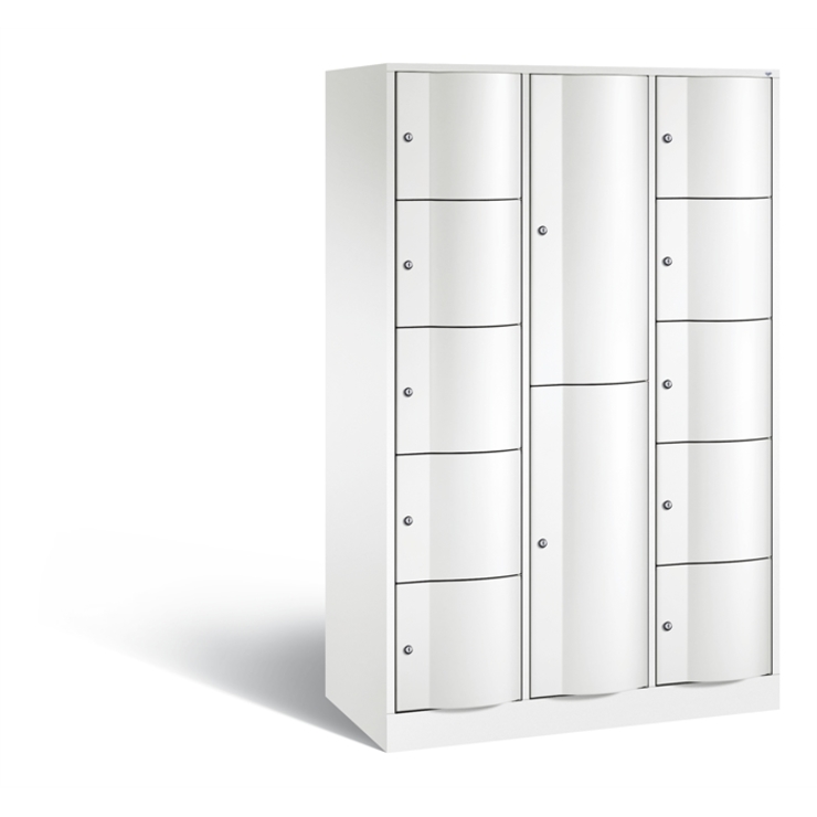 Stahl-Kombinations-Schließfachschrank Resisto, als Großraumschrank 3 Abteile mit 5 + 2 + 5 Fächern, Spezialtüren aus 1,5 mm Stahl, mit Wölbung nach vorne, absolut stabil und vandalismussicher, Türaufhängung durchgängig mit robustem Drehstangen-Scharnier, rechts angeschlagen, mit Belüftungs-Lochbild in der Rückwand und 20 mm Wandabstandhalter, auf 100 mm hohem Sockel mit 30 mm Niveauregulierung, innen pro großem Fach eine stabile Garderobenstange aus Ovalprofil mit 3 verdrehsicheren Schiebehaken 12 Drehzylinderschlösser mit 2 Schlüsseln, Schließkreis bis 6000 verschiedene Schließungen, Maße (H x B x T): 1950 x 1148 x 540 mm, Korpus: RAL 9016 Verkehrsweiß, Türen: RAL 9016 Verkehrsweiß