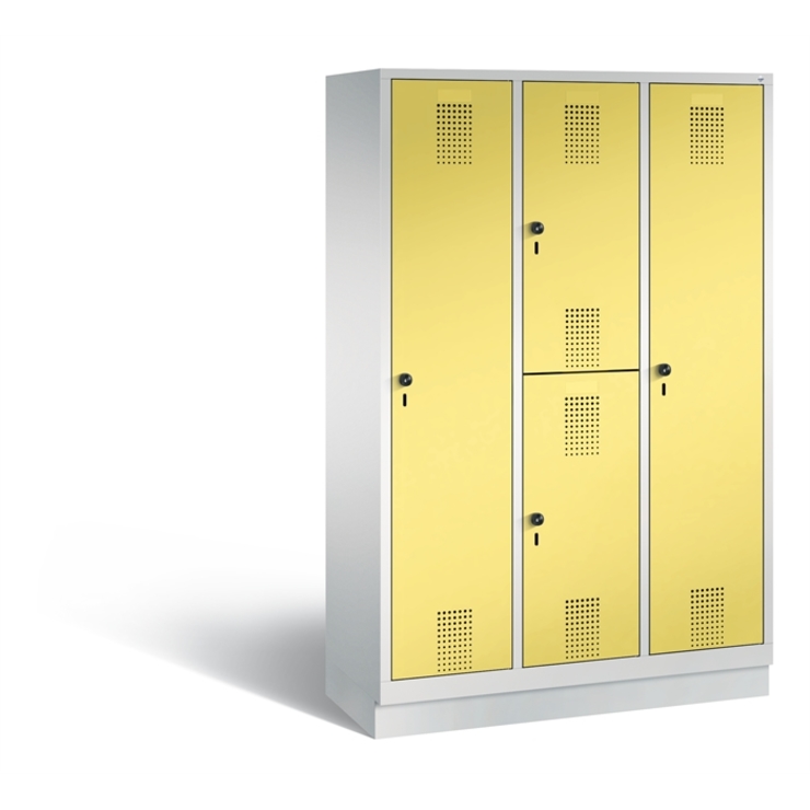 Stahl-Garderobenschrank Evolo, als Kombinationsschrank, 3 Abteile, Abteilbreite 400 mm, mittleres Abteil mit 2 Fächern, Korpus aus stabiler Stahlkonstruktion mit hochwertiger Einbrennbeschichtung für hohe UV- und Korrosionsbeständigkeit, linkes und rechtes Abteil innen mit 1 Ablageboden, darunter 1 stabile Garderobenstange aus Ovalprofil mit 3 verdrehsicheren Schiebehaken, mittleres Abteil innen je Fach 1 stabile Garderobenstange aus Ovalprofil mit 3 verdrehsicheren Schiebehaken, Schrankboden hinten mit großflächigem Luftdurchlass für optimale Luftzirkulation, auf 100 mm hohem Sockel, mit Kunststoffgleitern als praktischer Schrank- und Fußbodenschutz, vorne zurückgesetzt und oberhalb mit Luftdurchlass, 4 Ergonomische Sicherheits-Drehriegel für Vorhängeschlösser inkl. Tür-Schutz, Türen mit Anschlagsdämpfer und geschlossenen Seitenprofilen für höchste Stabilität und Einbruchsicherheit, mit reinigungsfreundlichem Belüftungslochbild oben und unten sowie eingeprägtem Etikettenrahmen, Türaufhängung in Drehbolzen, Maße (H x B x T): 1800 x 1200 x 500 mm, Korpus: RAL 7035 Lichtgrau, Türen Stahl: 0959059 RDS Schwefelgelb
