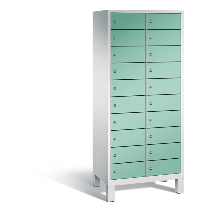 Stahl-Schließfachschrank Evolo, als Laptopschrank, 2 Abteile mit je 10 Fächern, Abteilbreite 400 mm, Korpus aus stabiler Stahlkonstruktion mit hochwertiger Einbrennbeschichtung für hohe UV- und Korrosionsbeständigkeit, auf 150 mm hohen Füßen aus Kunststoff für erweiterten Korrosionsschutz, mit integrierter Niveauregulierung und Schutzhülsen zur stilvollen Abdeckung der Verstellschrauben, bequem von innen und außen verstellbar, Belüftungsöffnungen in der Rückwand, 20 Tür mit Anschlagsdämpfer und geschlossenen Seitenprofilen für höchste Stabilität und Einbruchsicherheit, mit reinigungsfreundlichem Belüftungslochbild oben und unten sowie eingeprägtem Etikettenrahmen, Türaufhängung in Drehbolzen, Maße (H x B x T): 1850 x 810 x 500 mm, Korpus: RAL 7035 Lichtgrau, Türen Stahl: RAL 6027 Lichtgrün, Füße: RAL 7035 Lichtgrau