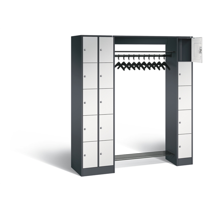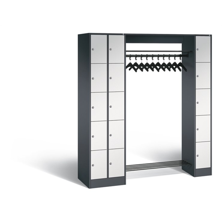 Doppelstöckiger Stahl-Garderobenschrank Evolo, 4 Abteile mit je 2 Fächern, Abteilbreite 300 mm, Korpus aus stabiler Stahlkonstruktion mit hochwertiger Einbrennbeschichtung für hohe UV- und Korrosionsbeständigkeit, innen je Fach 1 stabile Garderobenstange aus Ovalprofil mit 3 verdrehsicheren Schiebehaken, auf 100 mm hohem Sockel, mit Kunststoffgleitern als praktischer Schrank- und Fußbodenschutz, vorne zurückgesetzt, 8 Ergonomische Sicherheits-Drehriegel für Vorhängeschlösser inkl.... (mehr)? Papersmart hilft Ihnen, den besten Anbieter für Ihren gesamten Warenkorb zu ermitteln.