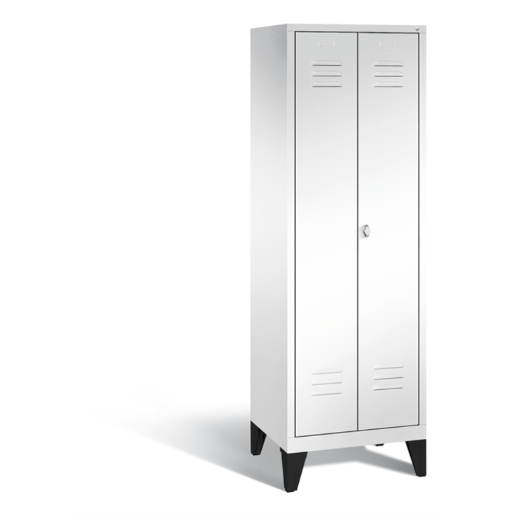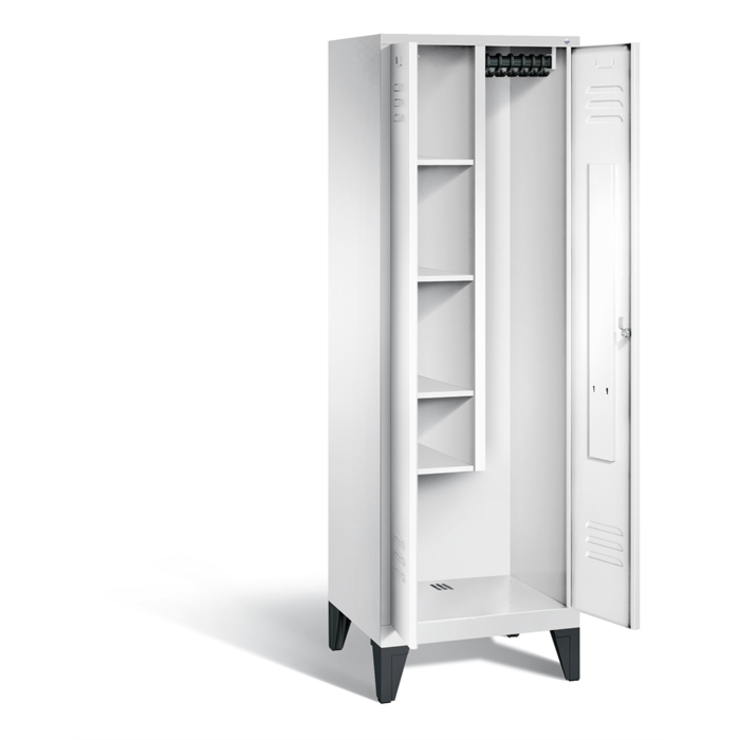 Stahl-Garderobenschrank Classic, Raumpflege-Geräteschrank, mit verkürzter Mitteltrennwand, Abteilbreite 300 mm, Türen zueinanderschlagend für gemeinsamen Verschluss, Korpus aus stabiler Stahlkonstruktion mit hochwertiger Einbrennbeschichtung für hohe UV- und Korrosionsbeständigkeit, links 4 fest eingebaute Einlegeböden, stabile Garderobenstange aus Ovalprofil mit 6 verdrehsicheren Schiebehaken, auf 150 mm hohen Füßen aus Kunststoff für optimalen Korrosionsschutz, 1 Drehriegel für Vorhangschloss, Türen mit Anschlagsdämpfer und mittiger Verstärkung für hohe Stabilität, mit Lüftungschlitzen oben und unten sowie eingestanztem Etikettenrahmen, Türaufhängung in Drehbolzen, Maße (H x B x T): 1850 x 610 x 500 mm, Korpus: RAL 9016 Verkehrsweiß, Türen Stahl: RAL 9016 Verkehrsweiß, Füße: RAL 9005 Tiefschwarz