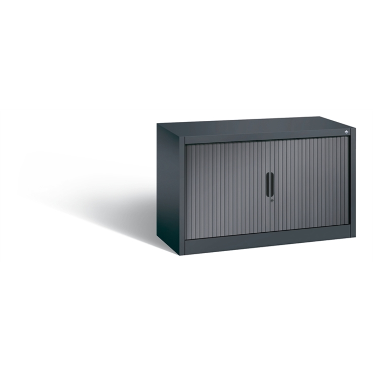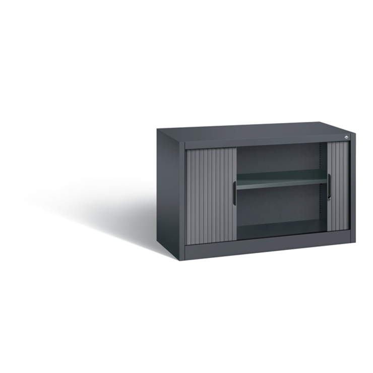 Stahl-Rollladenschrank Omnispace, Korpus aus stabiler Stahlkonstruktion mit hochwertiger Einbrennbeschichtung für hohe UV-Beständigkeit, mit Kunststoffgleitern als praktischer Schrank- und Fußbodenschutz, hohe Flexibilität der Inneneinrichtung durch Höhenverstellbarkeit im 15 mm Raster, Türen aus durchgehenden, flexiblen Kunststoff-Lamellen (Polypropylen) in Leichtlaufschienen, mit Aluminiumschlossleiste und praktischer Griffmulde für einfache Bedienung, 1 integrierte Niveauregulierung bis 10 mm, bequem von innen justierbar, 1 Drehzylinderschloss mit 2 Schlüsseln, 1 Einlegeboden aus Stahl lackiert, mit hoher Traglast 50 kg, Maße (H x B x T): 720 x 1200 x 420 mm, Korpus: RAL 7021 Schwarzgrau, Rollladen: RAL 7021 Schwarzgrau, Inneneinrichtung: RAL 7021 Schwarzgrau