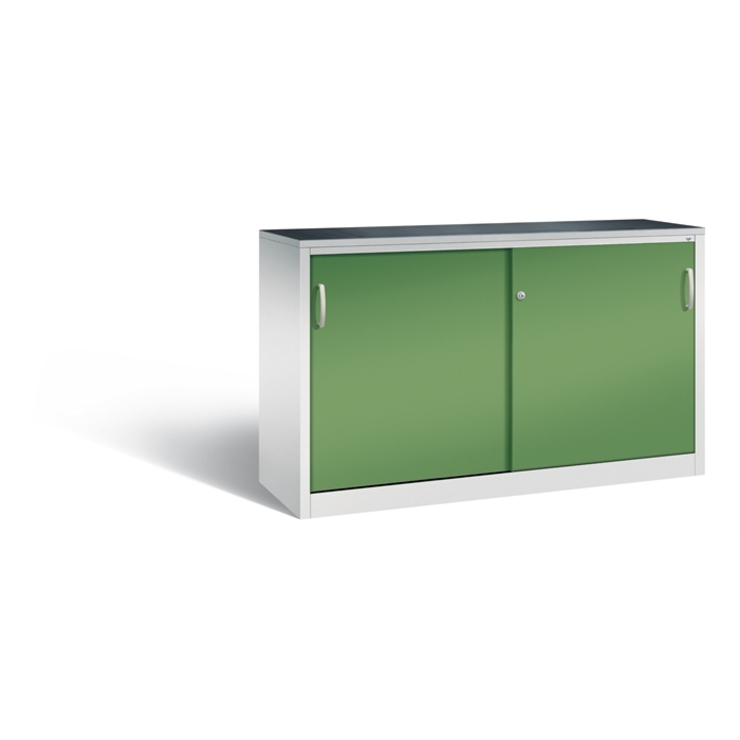 Stahl-Schiebetürenschrank Acurado-2000, Korpus aus stabiler Stahlkonstruktion mit hochwertiger Einbrennbeschichtung für hohe UV-Beständigkeit, mit Kunststoffgleitern als praktischer Schrank- und Fußbodenschutz, hohe Flexibilität der Inneneinrichtung durch Höhenverstellbarkeit im 15 mm Raster, Türen verstärkt für hohe Stabilität, leichtgängige Bedienung durch Leichtlaufrollen in spezieller Schienenführung, mit Mitteltrennwand, 2 Einlegeböden aus Stahl, verzinkt, 2 fach verstärkt, mit hoher Traglast von 110 Kg, 1 Wechselzylinder matt vernickelt mit 2 Schlüsseln, 1 inkl. Gummiriefenmatte zur Auflage auf den Schrank, selbstklebend, Maße (H x B x T): 1000 x 1600 x 500 mm, Korpus: RAL 7035 Lichtgrau, Türen: RAL 6011 Resedagrün, Inneneinrichtung: RAL 7035 Lichtgrau