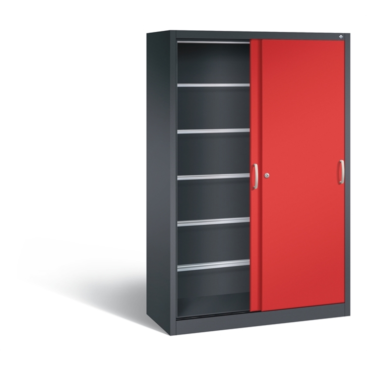 Stahl-Schiebetürenschrank Acurado-2000, Korpus aus stabiler Stahlkonstruktion mit hochwertiger Einbrennbeschichtung für hohe UV-Beständigkeit, mit Kunststoffgleitern als praktischer Schrank- und Fußbodenschutz, hohe Flexibilität der Inneneinrichtung durch Höhenverstellbarkeit im 15 mm Raster, Türen verstärkt für hohe Stabilität, leichtgängige Bedienung durch Leichtlaufrollen in spezieller Schienenführung, 1 Wechselzylinder matt vernickelt mit 2 Schlüsseln, 2 Ergonomische Bügelgriffe Ergolock aus Metall für einfache Bedienung, matt vernickelt, 6 Pendelstangen für Pendelmappen System Elba/Leitz, Maße (H x B x T): 1950 x 1200 x 500 mm, Korpus: RAL 7021 Schwarzgrau, Türen: RAL 3000 feuerrot, Inneneinrichtung: RAL 7035 Lichtgrau