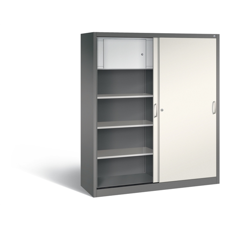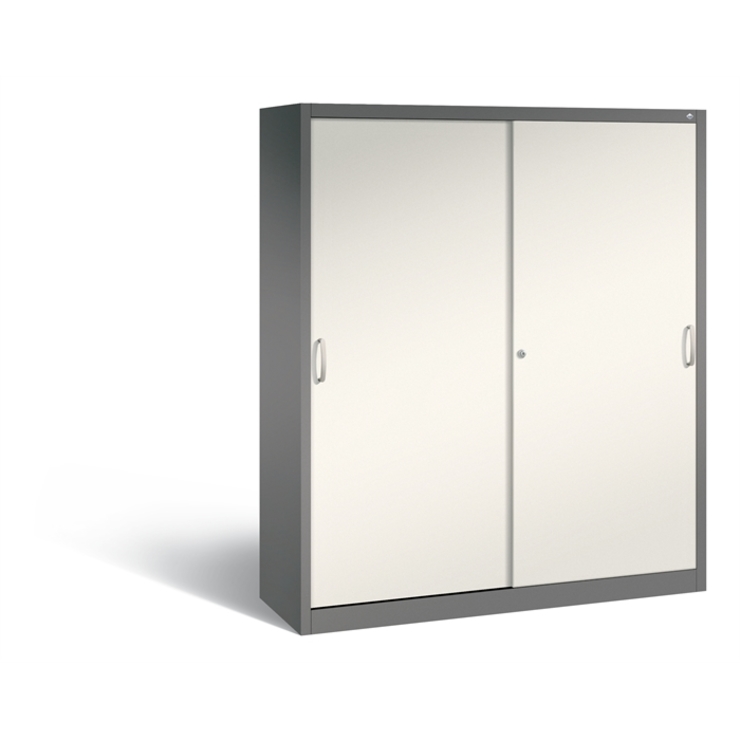 Stahl-Schiebetürenschrank Asisto, Korpus aus stabiler Stahlkonstruktion mit filigraner Kantenoptik und hochwertiger Einbrennbeschichtung für hohe UV-Beständigkeit, mit integrierter Niveauregulierung, bequem von innen bedienbar, hohe Flexibilität der Inneneinrichtung durch Höhenverstellbarkeit im 15 mm Raster, 1 Wechselzylinder matt vernickelt mit 2 Schlüsseln, 2 Ergonomische Design-Bügelgriffe für einfache Bedienung, aus Metall, matt vernickelt, 1 Abdeckplatte aus Stahl, 2 Stahltüren... (mehr)? Papersmart hilft Ihnen, den besten Anbieter für Ihren gesamten Warenkorb zu ermitteln.
