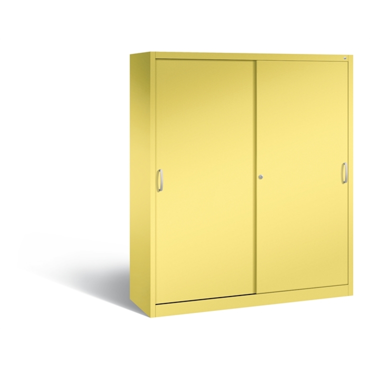 Stahl-Schiebetürenschrank Acurado-2000, Korpus aus stabiler Stahlkonstruktion mit hochwertiger Einbrennbeschichtung für hohe UV-Beständigkeit, mit Kunststoffgleitern als praktischer Schrank- und Fußbodenschutz, hohe Flexibilität der Inneneinrichtung durch Höhenverstellbarkeit im 15 mm Raster, Türen verstärkt für hohe Stabilität, leichtgängige Bedienung durch Leichtlaufrollen in spezieller Schienenführung, mit Mitteltrennwand, 1 Wechselzylinder matt vernickelt mit 2 Schlüsseln, 2 Ergonomische Bügelgriffe Ergolock aus Metall für einfache Bedienung, matt vernickelt, 12 Pendelstangen für Pendelmappen System Elba/Leitz, Maße (H x B x T): 1950 x 1600 x 500 mm, Korpus: 0959059 RDS Schwefelgelb, Türen: 0959059 RDS Schwefelgelb, Inneneinrichtung: RAL 7035 Lichtgrau