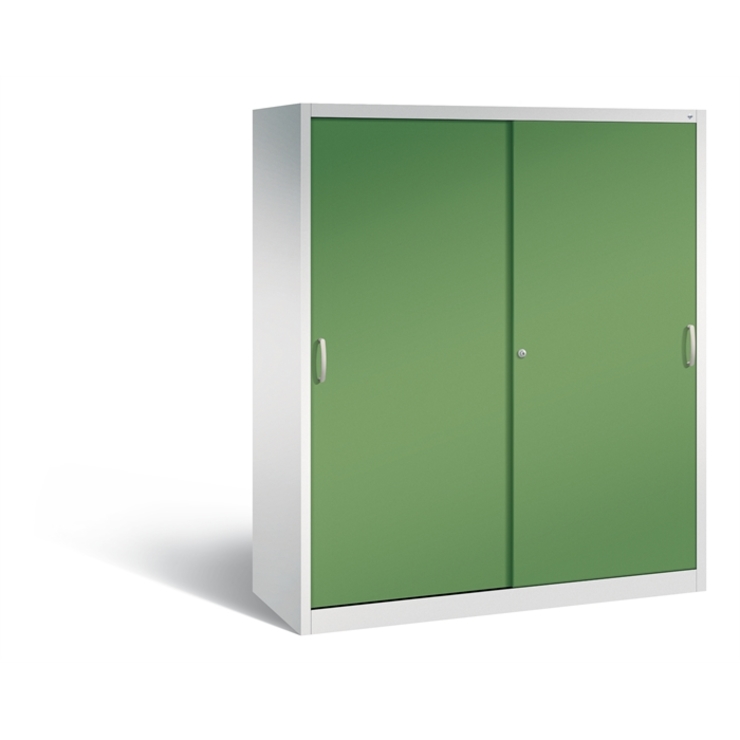 Stahl-Schiebetürenschrank Acurado-2000, Korpus aus stabiler Stahlkonstruktion mit hochwertiger Einbrennbeschichtung für hohe UV-Beständigkeit, mit Kunststoffgleitern als praktischer Schrank- und Fußbodenschutz, hohe Flexibilität der Inneneinrichtung durch Höhenverstellbarkeit im 15 mm Raster, Türen verstärkt für hohe Stabilität, leichtgängige Bedienung durch Leichtlaufrollen in spezieller Schienenführung, mit Mitteltrennwand, 1 Wechselzylinder matt vernickelt mit 2 Schlüsseln, 2 Ergonomische Bügelgriffe Ergolock aus Metall für einfache Bedienung, matt vernickelt, 8 Einlegeböden aus Stahl, verzinkt, mit hoher Traglast 70 kg, Maße (H x B x T): 1950 x 1600 x 600 mm, Korpus: RAL 7035 Lichtgrau, Türen: RAL 6011 Resedagrün