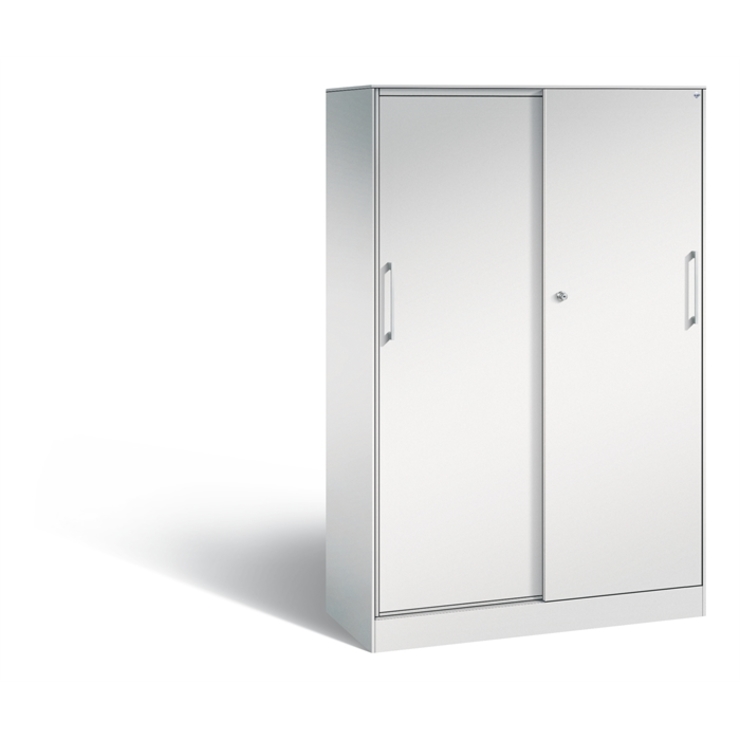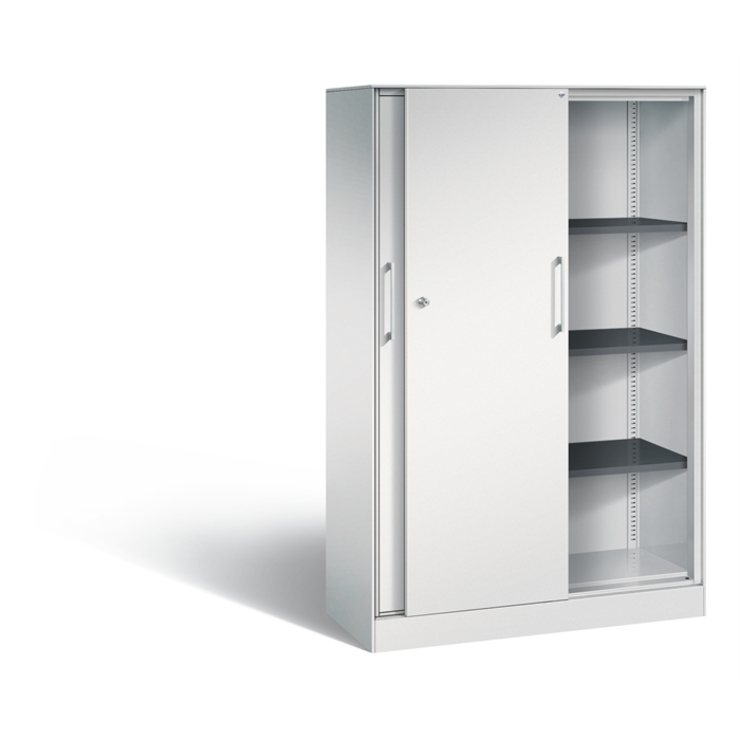 Stahl-Schiebetürenschrank Asisto, Korpus aus stabiler Stahlkonstruktion mit filigraner Kantenoptik und hochwertiger Einbrennbeschichtung für hohe UV-Beständigkeit, mit integrierter Niveauregulierung, bequem von innen bedienbar, hohe Flexibilität der Inneneinrichtung durch Höhenverstellbarkeit im 15 mm Raster, 1 Wechselzylinder matt vernickelt mit 2 Schlüsseln, 2 Ergonomische Design-Bügelgriffe für einfache Bedienung, aus Metall, matt vernickelt, 1 Abdeckplatte aus Stahl, 2 Stahltüren doppelwandig, gedämmt für angenehmes Geräuschverhalten, leichtgängige Bedienung durch Leichtlaufrollen in spezieller Schienenführung, 3 Einlegeböden aus Stahl lackiert, mit hoher Traglast von 70 kg, Maße (H x B x T): 1635 x 1000 x 435 mm, Korpus: RAL 7035 Lichtgrau, Türen: RAL 7035 Lichtgrau, Inneneinrichtung: RAL 7021 Schwarzgrau