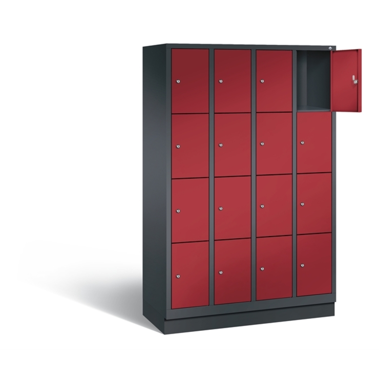 Stahl-Fächerschrank Classic, 4 Abteile mit 4 Fächern, Abteilbreite 300 mm, Korpus aus stabiler Stahlkonstruktion mit hochwertiger Einbrennbeschichtung für hohe UV- und Korrosionsbeständigkeit, auf 100 mm hohem Sockel, mit Kunststoffgleitern als praktischer Schrank- und Fußbodenschutz, vorne zurückgesetzt, 16 Zylinderschlösser mit je 2 Schlüsseln, Schließkreis bis 1000 verschiedene Schließungen, Türen mit Anschlagsdämpfer, Türaufhängung in Drehbolzen, Maße (H x B x T): 1800 x 1190 x 500 mm, Korpus: RAL 7021 Schwarzgrau, Türen Stahl: RAL 3003 Rubinrot