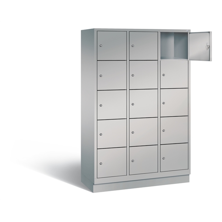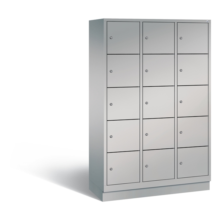Stahl-Fächerschrank Classic, 3 Abteile mit 5 Fächern, Abteilbreite 400 mm, Korpus aus stabiler Stahlkonstruktion mit hochwertiger Einbrennbeschichtung für hohe UV- und Korrosionsbeständigkeit, auf 100 mm hohem Sockel, mit Kunststoffgleitern als praktischer Schrank- und Fußbodenschutz, vorne zurückgesetzt, 15 Zylinderschlösser mit je 2 Schlüsseln, Schließkreis bis 1000 verschiedene Schließungen, Türen mit Anschlagsdämpfer, Türaufhängung in Drehbolzen, Maße (H x B x T): 1800 x 1200 x 500 mm, Korpus: RAL 9006 Weißaluminium, Türen Stahl: RAL 9006 Weißaluminium