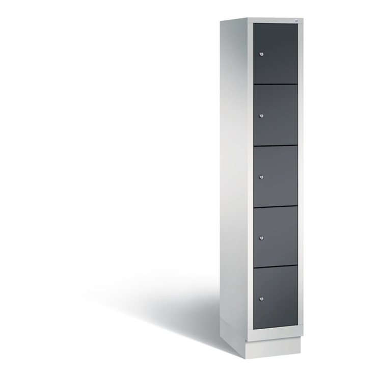 Stahl-Fächerschrank Classic, 1 Abteil mit 5 Fächern, Abteilbreite 300 mm, Korpus aus stabiler Stahlkonstruktion mit hochwertiger Einbrennbeschichtung für hohe UV- und Korrosionsbeständigkeit, auf 100 mm hohem Sockel, mit Kunststoffgleitern als praktischer Schrank- und Fußbodenschutz, vorne zurückgesetzt, 5 Zylinderschlösser mit je 2 Schlüsseln, Schließkreis bis 1000 verschiedene Schließungen, Türen mit Anschlagsdämpfer, Türaufhängung in Drehbolzen, Maße (H x B x T): 1800 x 320 x 500 mm, Korpus: RAL 7035 Lichtgrau, Türen Stahl: RAL 7021 Schwarzgrau