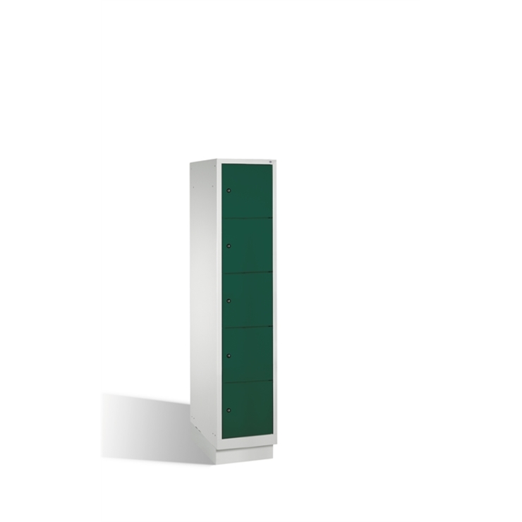 Stahl-Fächerschrank Classic, 1 Abteil mit 5 Fächern, Abteilbreite 400 mm, Korpus aus stabiler Stahlkonstruktion mit hochwertiger Einbrennbeschichtung für hohe UV- und Korrosionsbeständigkeit, auf 100 mm hohem Sockel, mit Kunststoffgleitern als praktischer Schrank- und Fußbodenschutz, vorne zurückgesetzt, 5 Zylinderschlösser mit je 2 Schlüsseln, Schließkreis bis 1000 verschiedene Schließungen, Türen mit Anschlagsdämpfer, Türaufhängung in Drehbolzen, Maße (H x B x T): 1800 x 420 x 500 mm, Korpus: RAL 7035 Lichtgrau, Türen Stahl: RAL 6005 Moosgrün