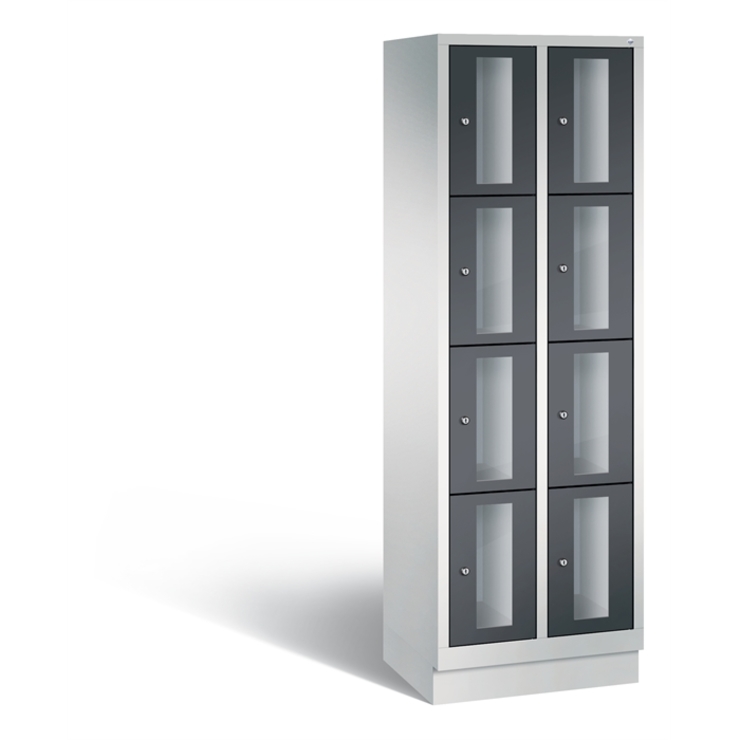 Stahl-Fächerschrank Classic, 2 Abteile mit 4 Fächern, Abteilbreite 300 mm, Korpus aus stabiler Stahlkonstruktion mit hochwertiger Einbrennbeschichtung für hohe UV- und Korrosionsbeständigkeit, auf 100 mm hohem Sockel, mit Kunststoffgleitern als praktischer Schrank- und Fußbodenschutz, vorne zurückgesetzt, 8 Zylinderschlösser mit je 2 Schlüsseln, Schließkreis bis 1000 verschiedene Schließungen, 1 Türen mit Sichtfenster aus Acrylglas für direkten Einblick, Türaufhängung in Drehbolzen mit Öffnungswinkel von ca. 110 Grad, inkl. Anschlagsdämpfer für angenehmes Schließverhalten, Maße (H x B x T): 1800 x 610 x 500 mm, Korpus: RAL 7035 Lichtgrau, Türen Stahl: RAL 7021 Schwarzgrau
