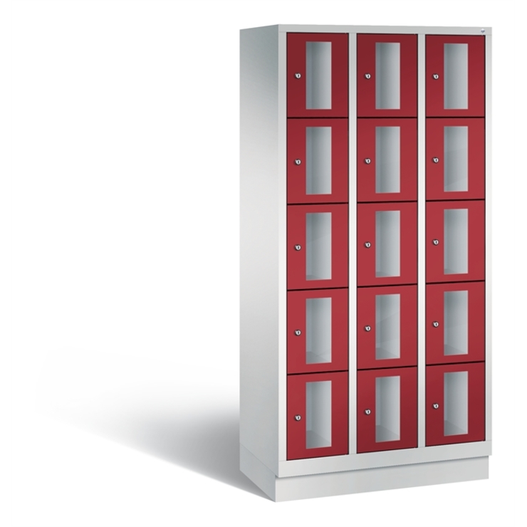 Stahl-Fächerschrank Classic, 3 Abteile mit 5 Fächern, Abteilbreite 300 mm, Korpus aus stabiler Stahlkonstruktion mit hochwertiger Einbrennbeschichtung für hohe UV- und Korrosionsbeständigkeit, auf 100 mm hohem Sockel, mit Kunststoffgleitern als praktischer Schrank- und Fußbodenschutz, vorne zurückgesetzt, 15 Zylinderschlösser mit je 2 Schlüsseln, Schließkreis bis 1000 verschiedene Schließungen, 1 Türen mit Sichtfenster aus Acrylglas für direkten Einblick, Türaufhängung in Drehbolzen mit Öffnungswinkel von ca. 110 Grad, inkl. Anschlagsdämpfer für angenehmes Schließverhalten, Maße (H x B x T): 1800 x 900 x 500 mm, Korpus: RAL 7035 Lichtgrau, Türen Stahl: RAL 3003 Rubinrot