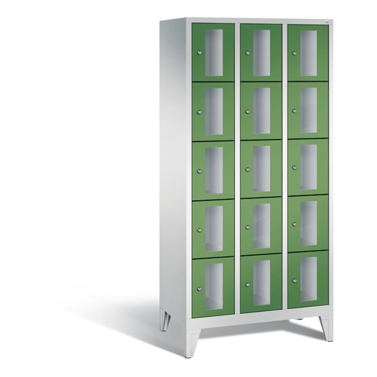 Stahl-Fächerschrank Classic, 3 Abteile mit 5 Fächern, Abteilbreite 300 mm, Korpus aus stabiler Stahlkonstruktion mit hochwertiger Einbrennbeschichtung für hohe UV- und Korrosionsbeständigkeit, auf 150 mm hohen Füßen aus Kunststoff für erweiterten Korrosionsschutz, 15 Zylinderschlösser mit je 2 Schlüsseln, Schließkreis bis 1000 verschiedene Schließungen, 1 Türen mit Sichtfenster aus Acrylglas für direkten Einblick, Türaufhängung in Drehbolzen mit Öffnungswinkel von ca. 110 Grad, inkl. Anschlagsdämpfer für angenehmes Schließverhalten, Maße (H x B x T): 1850 x 900 x 500 mm, Korpus: RAL 7035 Lichtgrau, Türen Stahl: RAL 6011 Resedagrün, Füße: RAL 7035 Lichtgrau