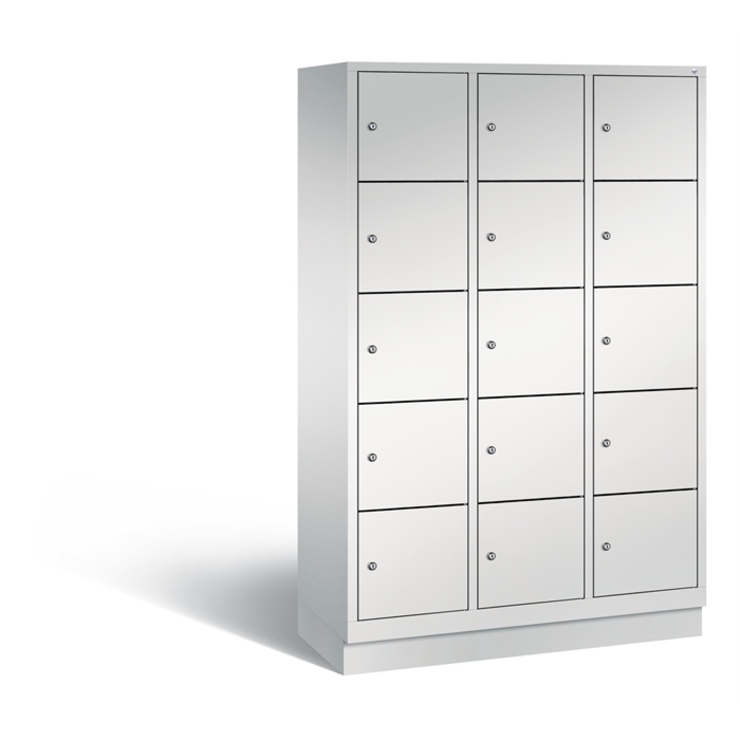 Stahl-Fächerschrank Evolo, 3 Abteile mit je 5 Fächern, Abteilbreite 400 mm, Korpus aus stabiler Stahlkonstruktion mit hochwertiger Einbrennbeschichtung für hohe UV- und Korrosionsbeständigkeit, auf 100 mm hohem Sockel, mit Kunststoffgleitern als praktischer Schrank- und Fußbodenschutz, vorne zurückgesetzt, 15 Zylinderschlösser mit je 2 Schlüsseln, Schließkreis bis 1000 verschiedene Schließungen, Türen mit Anschlagsdämpfer, Türaufhängung in Drehbolzen, Maße (H x B x T): 1800 x 1200 x 500 mm, Korpus: RAL 7035 Lichtgrau, Türen Stahl: RAL 7035 Lichtgrau