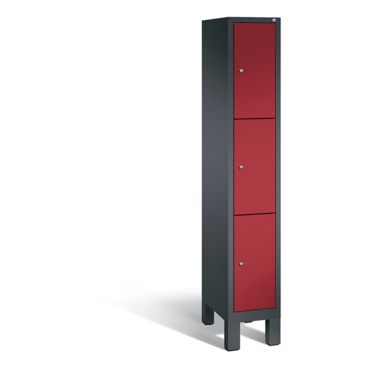 Stahl-Fächerschrank Evolo, 1 Abteil mit 3 Fächern, Abteilbreite 300 mm, Korpus aus stabiler Stahlkonstruktion mit hochwertiger Einbrennbeschichtung für hohe UV- und Korrosionsbeständigkeit, auf 150 mm hohen Füßen aus Kunststoff für erweiterten Korrosionsschutz, mit integrierter Niveauregulierung und Schutzhülsen zur stilvollen Abdeckung der Verstellschrauben, bequem von innen und außen verstellbar, 3 Zylinderschlösser mit je 2 Schlüsseln, Schließkreis bis 1000 verschiedene Schließungen, Türen mit Anschlagsdämpfer, Türaufhängung in Drehbolzen, Maße (H x B x T): 1850 x 320 x 500 mm, Korpus: RAL 7021 Schwarzgrau, Türen Stahl: RAL 3003 Rubinrot, Füße: RAL 9005 Tiefschwarz