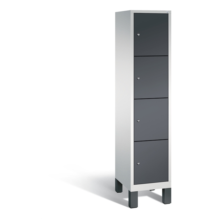 Stahl-Fächerschrank Evolo, 1 Abteil mit 4 Fächern, Abteilbreite 400 mm, Korpus aus stabiler Stahlkonstruktion mit hochwertiger Einbrennbeschichtung für hohe UV- und Korrosionsbeständigkeit, auf 150 mm hohen Füßen aus Kunststoff für erweiterten Korrosionsschutz, mit integrierter Niveauregulierung und Schutzhülsen zur stilvollen Abdeckung der Verstellschrauben, bequem von innen und außen verstellbar, 4 Zylinderschlösser mit je 2 Schlüsseln, Schließkreis bis 1000 verschiedene Schließungen, Türen mit Anschlagsdämpfer, Türaufhängung in Drehbolzen, Maße (H x B x T): 1850 x 420 x 500 mm, Korpus: RAL 7035 Lichtgrau, Türen Stahl: RAL 7021 Schwarzgrau, Füße: RAL 7035 Lichtgrau