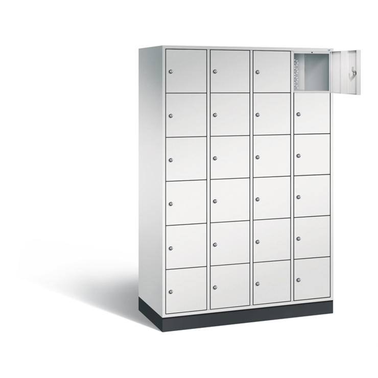 Stahl-Schließfachschrank Intro, 4 Abteile mit 6 Fächern, Abteilbreite 300 mm, Korpus aus stabiler Stahlkonstruktion mit hochwertiger Einbrennbeschichtung für hohe UV- und Korrosionsbeständigkeit, Türen doppelwandig für hohe Stabilität, mit Anschlagsdämpfer, Türaufhängung durchgängig mit robustem Scharnierband, rechts angeschlagen, Rückwand mit großflächigem Luftdurchlass und 18 mm Wandabstandshaltern, auf 100 mm hohem Sockel, 24 Zylinderschlösser mit je 2 Schlüsseln, Schließkreis bis 1000 verschiedene Schließungen, Maße (H x B x T): 1950 x 1220 x 490 mm, Korpus: RAL 7035 Lichtgrau, Türen: RAL 7035 Lichtgrau, Sockel: RAL 7021 Schwarzgrau