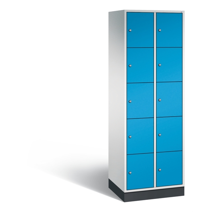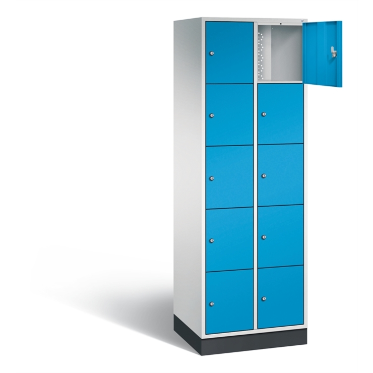 Stahl-Schließfachschrank Intro, 2 Abteile mit 5 Fächern, Abteilbreite 300 mm, Korpus aus stabiler Stahlkonstruktion mit hochwertiger Einbrennbeschichtung für hohe UV- und Korrosionsbeständigkeit, Türen doppelwandig für hohe Stabilität, mit Anschlagsdämpfer, Türaufhängung durchgängig mit robustem Scharnierband, rechts angeschlagen, Rückwand mit großflächigem Luftdurchlass und 18 mm Wandabstandshaltern, auf 100 mm hohem Sockel, 10 Zylinderschlösser mit je 2 Schlüsseln, Schließkreis bis 1000 verschiedene Schließungen, Maße (H x B x T): 1950 x 620 x 490 mm, Korpus: RAL 7035 Lichtgrau, Türen: RAL 5012 Lichtblau, Sockel: RAL 7021 Schwarzgrau