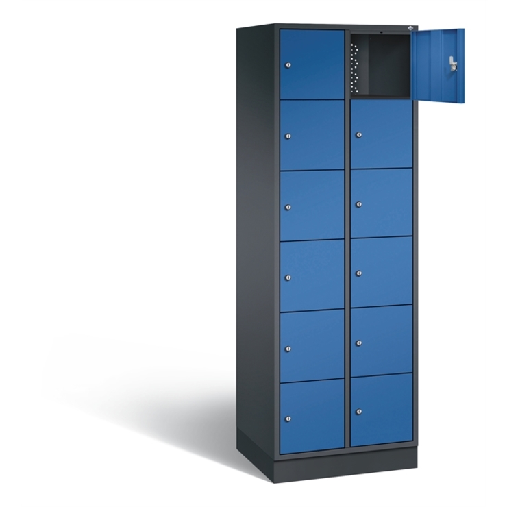 Stahl-Schließfachschrank Intro, 2 Abteile mit 6 Fächern, Abteilbreite 300 mm, Korpus aus stabiler Stahlkonstruktion mit hochwertiger Einbrennbeschichtung für hohe UV- und Korrosionsbeständigkeit, Türen doppelwandig für hohe Stabilität, mit Anschlagsdämpfer, Türaufhängung durchgängig mit robustem Scharnierband, rechts angeschlagen, Rückwand mit großflächigem Luftdurchlass und 18 mm Wandabstandshaltern, auf 100 mm hohem Sockel, 12 Zylinderschlösser mit je 2 Schlüsseln, Schließkreis bis 1000 verschiedene Schließungen, Maße (H x B x T): 1950 x 620 x 490 mm, Korpus: RAL 7021 Schwarzgrau, Türen: RAL 5010 Enzianblau, Sockel: RAL 7021 Schwarzgrau